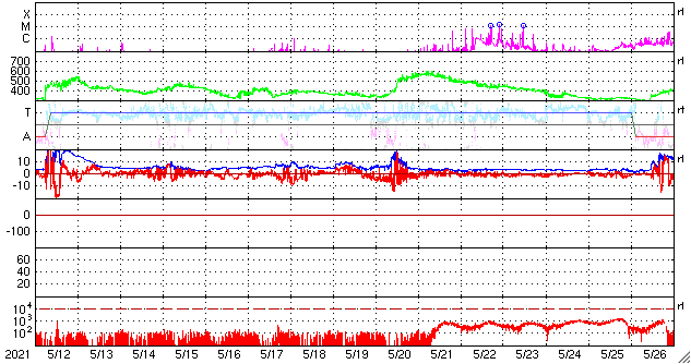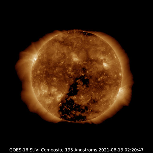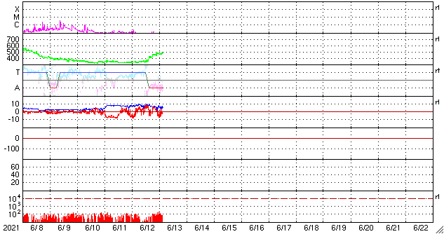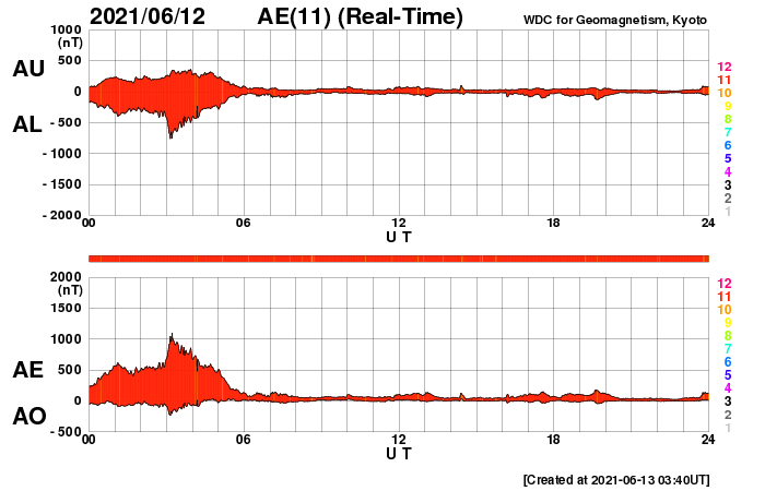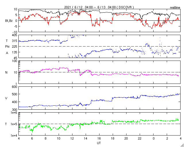 2021/ 6/13 12:56 更新 太陽風の速度が500km/秒近くに高まっています。 担当 篠原 昨夜から太陽風の速度が上昇を始め、 昨日の330km/秒の低速風から、 現在は490km/秒と高速の状態に変わっています。 太陽の南半球に見えているコロナホールの影響が、 2〜3日後から始まりそうだと考えていましたが、 その影響はもっと手前まで広がっていたのかもしれません、 磁場強度は、9nTから5nTに下がり、 平均的な状態に戻っています。 南北成分は、 速度が高まる頃から南向きにも変化するようになり、 AE指数のグラフは、 最後で500nTの中規模の変化が発生しています。 この後も太陽風磁場の南向きの変化が見られれば、 速度が高まっているので、磁気圏の活動も活発になるでしょう。 現在もSDO衛星のWebページが停止しているので、 GOES衛星SUVI 195の写真を掲載します。 太陽の南半球でコロナホールが縦に大きく広がっています。 現在、この領域から地球の方向へ高速の太陽風が吹き出しているので、 3〜4日後にかけて、太陽風はもう一段強まるかもしれません。 太陽は、NOAAの報告書では無黒点になっています。 昨日見えいていた小さい黒点は、消えてしまった様です。 X線グラフは変化がなく、太陽は穏やかです。 ![]() GOES衛星SUVI 195による太陽コロナ写真。 (c) GOES (NOAA) ![]() DSCOVRが観測した太陽風の磁場(1番上の枠、黒線は全体の強度、赤線は南北成分) および、太陽風の密度(3番目の紫線)、速度(4番目の青線) (c) データ:NOAA/SWPC、作図:宇宙天気ニュース ![]() AE指数(速報値) 下段のAEグラフの値が高くなると、オーロラ活動が活発化しています。 (c) 京都大学WDC ![]() ![]() 27日の太陽周期に合わせたデータプロット 太陽が同じ面を地球に向けていた27日前の変化から、今後を予想することができます。 (c) 作図:宇宙天気ニュース