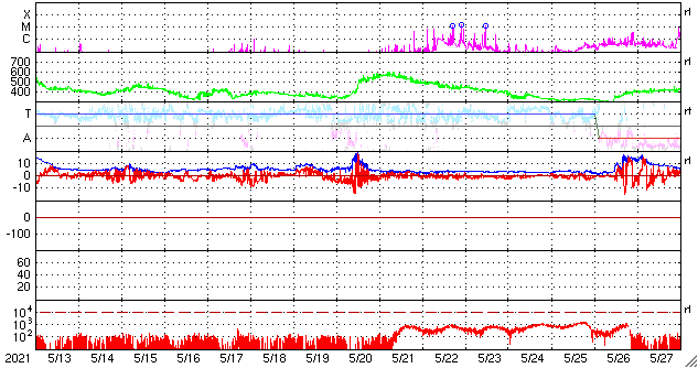 GOES衛星の太陽X線強度。赤・橙 = 0.1〜0.8 nm、青・紫 = 0.05〜0.4 nm (c) データ:NOAA/SWPC、作図:宇宙天気ニュース ![]() | ||||||||||||||||||||||||||||||||||||||||||||||||||||||||||||||||||||||||||||||||||||||||||||||||||||||||||||||||||||||||||||||||||||||||||||||||||||||||||||||||||||||||||||||||||||||||||||||||||||||||||||||