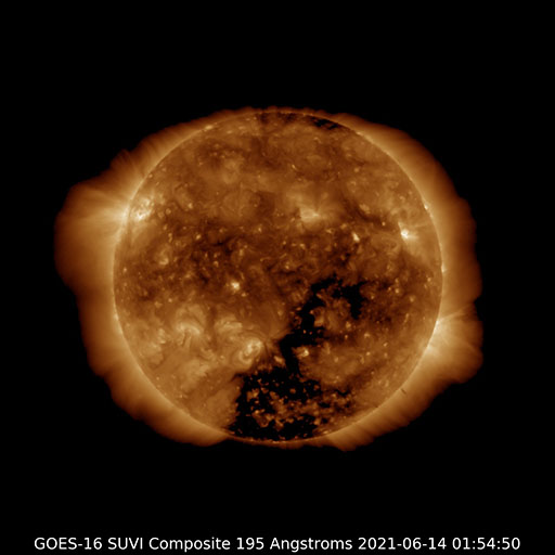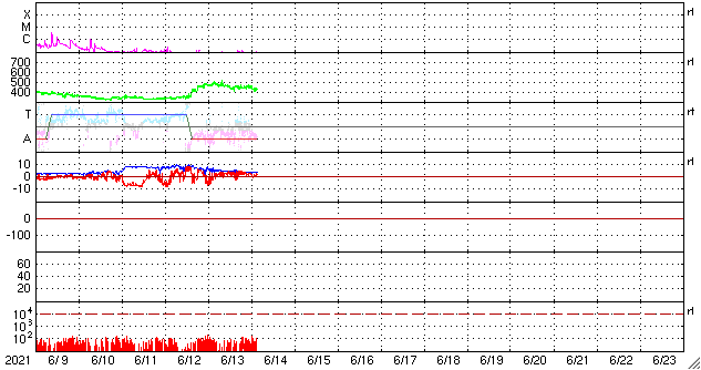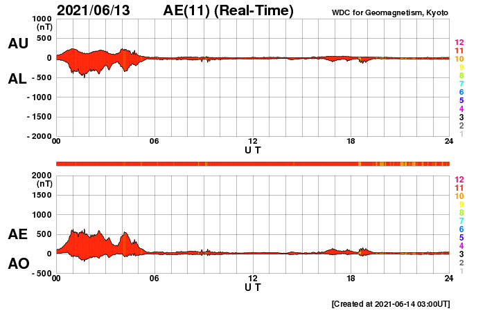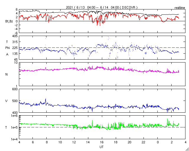2021/ 6/14 12:13 更新 太陽風は平均的な速度に戻っています。磁気圏は穏やかです。 担当 篠原 太陽風の速度は、昨日のニュース以降は次第に低下して、 現在は430km/秒と平均的な状態に戻っています。 磁場強度も5nTから3nTへ下がって、 やや弱くなっています。 速度の高まりは、一時的な変化で終わっています。 磁場の南北成分は、北寄りが続いています。 このため磁気圏は穏やかで、 AE指数は、昨日の最後の高まり以降は変化がありません。 今日もGOES衛星のSUVI 195を掲載しています。 南半球のコロナホールは、 太陽の中心線から西に広がっています。 明日か明後日くらいから、 この領域の影響で太陽風が強まる可能性があります。 太陽は、北東の端(左上)に新しい黒点が現れて、 2833群と番号が付けられています。 SUVI 195の画像で、明るく光っている領域です。 X線グラフに変化はなく, 太陽は穏やかな状態で推移しています。 ![]() GOES衛星SUVI 195による太陽コロナ写真。 (c) GOES (NOAA) ![]() DSCOVRが観測した太陽風の磁場(1番上の枠、黒線は全体の強度、赤線は南北成分) および、太陽風の密度(3番目の紫線)、速度(4番目の青線) (c) データ:NOAA/SWPC、作図:宇宙天気ニュース ![]() AE指数(速報値) 下段のAEグラフの値が高くなると、オーロラ活動が活発化しています。 (c) 京都大学WDC ![]() ![]() 27日の太陽周期に合わせたデータプロット 太陽が同じ面を地球に向けていた27日前の変化から、今後を予想することができます。 (c) 作図:宇宙天気ニュース