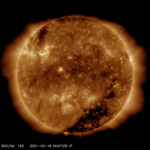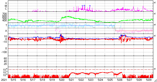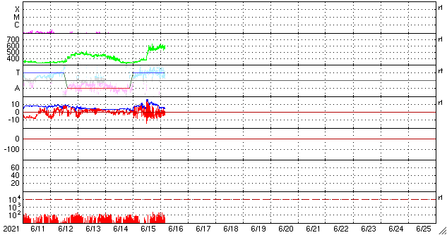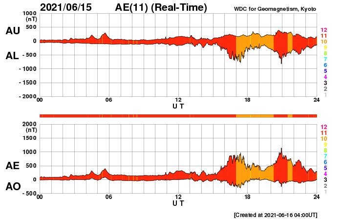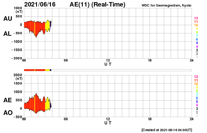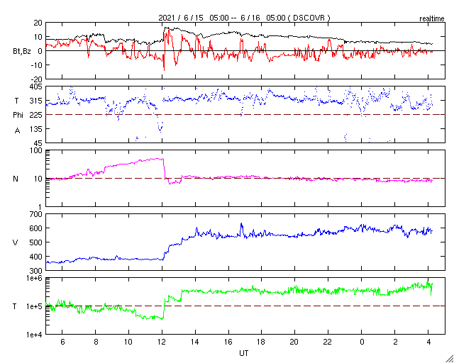 2021/ 6/16 13:23 更新 高速太陽風が到来し、磁気圏の活動も強まっています。 担当 篠原 コロナホールの影響が始まって、太陽風の速度が高まっています。 DSCOVR衛星の観測によると、 昨夜、15日21時(世界時15日12時)から太陽風の速度が高まり、 370km/秒の低速の状態から、 2時間ほどで550km/秒の高速風に変わりました。 その後、速度はもう少し上がり、 570〜600km/秒で推移しています。 太陽風の磁場強度も15nTくらいに強まりました。 その後は次第に下がって、 現在は5nTと平均的な状態に戻っています。 磁場の南北成分は、 磁場が強まった頃に -5nT程度の南向きの変化が度々発生し、 磁気圏の活動も強まっています。 AE指数では、800〜1000nTくらいの中規模の変化が 続く様になっています。 太陽風のグラフの右端を見ると、 磁場強度が下がるとともに 南北の変化は小さくなっています。 このため、磁気圏の活動は、 この後、規模が一段下がりそうです。 SDO衛星AIA193では、 南半球のコロナホールは、西側にだいぶ進んでいます。 コロナホールの低緯度側の東西の幅を考えると、 高速風は、2日くらいで速度が下がり始めるかもしれません。 太陽は、北東(左上)に2833黒点群が見えていますが、 X線グラフは変化がなく、太陽は穏やかです。