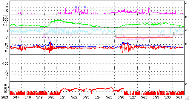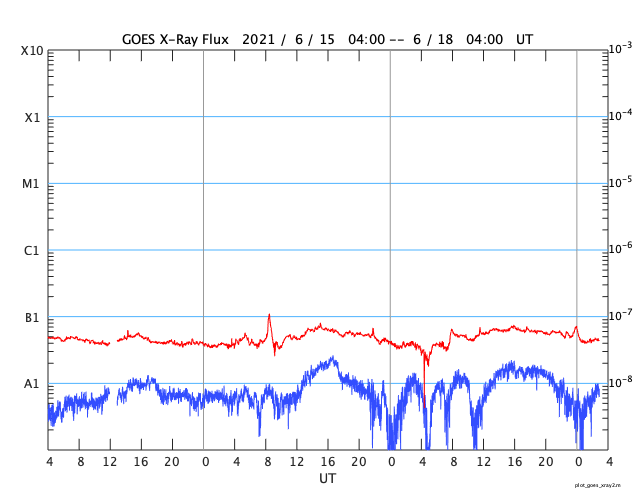 GOES衛星の太陽X線強度。赤・橙 = 0.1〜0.8 nm、青・紫 = 0.05〜0.4 nm (c) データ:NOAA/SWPC、作図:宇宙天気ニュース ![]() | ||||||||||||||||||||||||||||||||||||||||||||||||||||||||||||||||||||||||||||||||||||||||||||||||||||||||||||||||||||||||||||||||||||||||||||||||||||||||||||||||||||||||||||||||||||||||||||||||||||||||||
