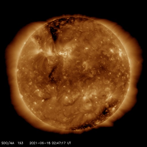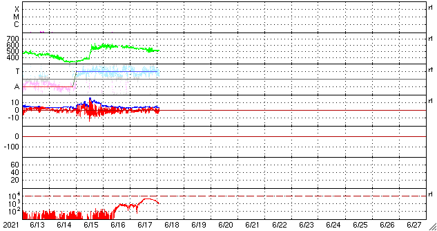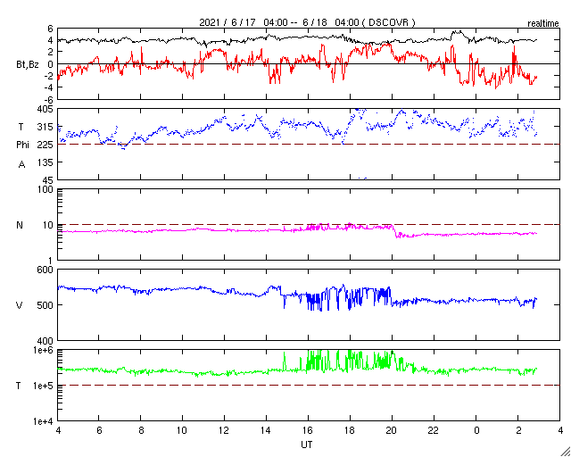 2021/ 6/18 12:04 更新 高速太陽風は終わりに近付いている様です。太陽に新しい黒点が現れています。 担当 篠原 昨日のニュース以降も太陽風の速度はゆっくりと低下して、 510km/秒まで下がっています。 まだ高速風の状態ですが、この後も速度は下がりそうです。 太陽風の磁場強度は、4nTと平均的な状態です。 磁場の南北成分は、0nT付近で小さく変化していて、 磁気圏は穏やかになっています。 AE指数は特に変化の見られない状態です。 太陽風のグラフの最後では、 磁場が弱い南向きに変化しています。 この傾向が続くと、 磁気圏でも活動がやや高まる様になるでしょう。 SDO衛星AIA193を見ると、 太陽の北極側から北東部に細いコロナホールが伸びています。 この広がり方だと、地球への影響は小さくなりそうですが、 明日、明後日はどの様に見えるでしょうか。 太陽は、北西の端近く(右上)に黒点が発生しています。 X線グラフは変化がなく、 太陽は穏やかな状態が続いています。 ![]() SDO衛星のAIA193カメラによる太陽コロナの様子 (c) SDO (NASA) ![]() SDO衛星による太陽の可視光写真。マウスの矢印を写真に重ねると、黒点番号付きの写真に切り替わります。 (c) SDO (NASA) ![]() DSCOVRが観測した太陽風の磁場(1番上の枠、黒線は全体の強度、赤線は南北成分) および、太陽風の密度(3番目の紫線)、速度(4番目の青線) (c) データ:NOAA/SWPC、作図:宇宙天気ニュース ![]() AE指数(速報値) 下段のAEグラフの値が高くなると、オーロラ活動が活発化しています。 (c) 京都大学WDC ![]() ![]() 27日の太陽周期に合わせたデータプロット 太陽が同じ面を地球に向けていた27日前の変化から、今後を予想することができます。 (c) 作図:宇宙天気ニュース