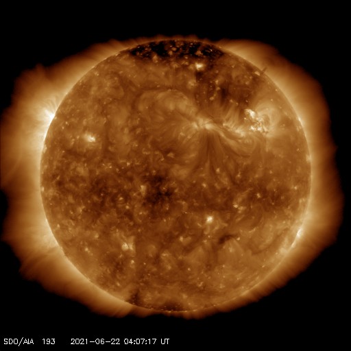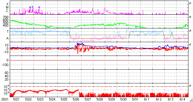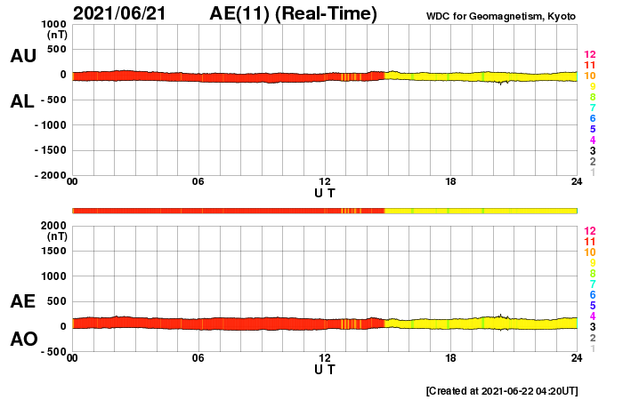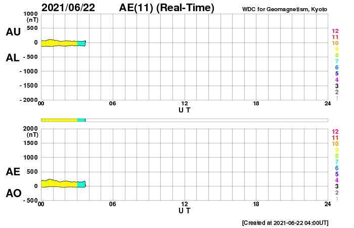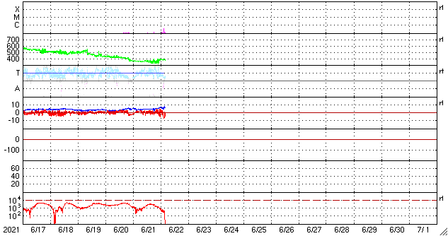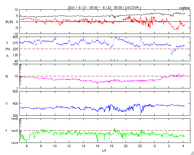 2021/ 6/22 13:23 更新 太陽風はやや低速で、磁気圏も穏やかです。 担当 篠原 太陽風の速度は、360km/秒から380km/秒へ少し上がり、 やや低速の状態です。 磁場強度は、 4nTからグラフの最後で7nTへ少し強まっています。 磁気圏は穏やかで、 AE指数はほとんど変化のない状態です。 SDO衛星AIA193を見ると、 北極から縦に伸びていたコロナホールが西に進み、 この後、弱い影響が見られるかもしれません。 現在の太陽の中心部から東側にかけては、 コロナホールは見られず、 基本的には、太陽風は穏やかな状態が続きそうです。 太陽は、北西(右上)に2833黒点群があるだけで、 活動は穏やかです。 東端の向こう側から活動的な領域が近づいていますが、 まだ、北東の端(左上)に白斑が見え始めたくらいです。 SDO衛星AIA131の動画を見ると、 今のところ、東端の向こう側の活動が 強まっている様子はありません。