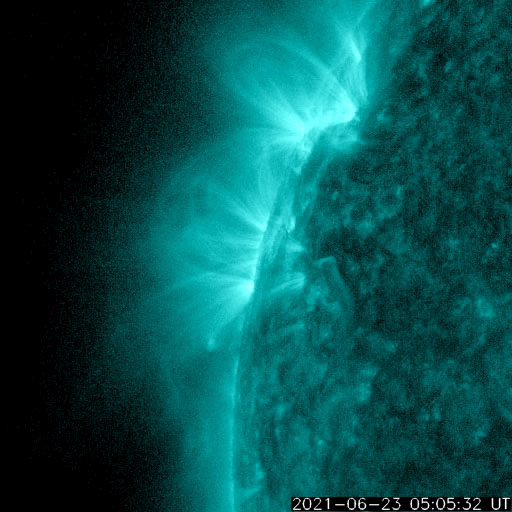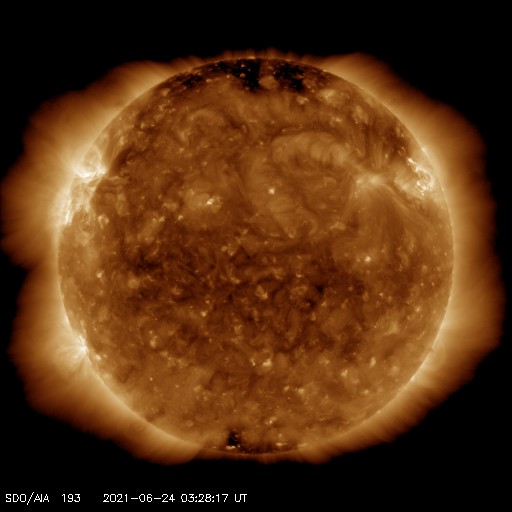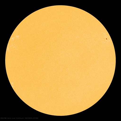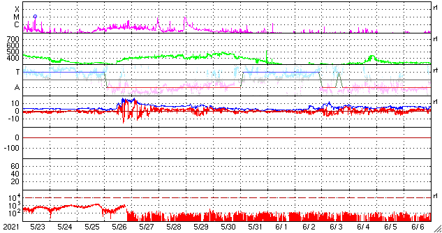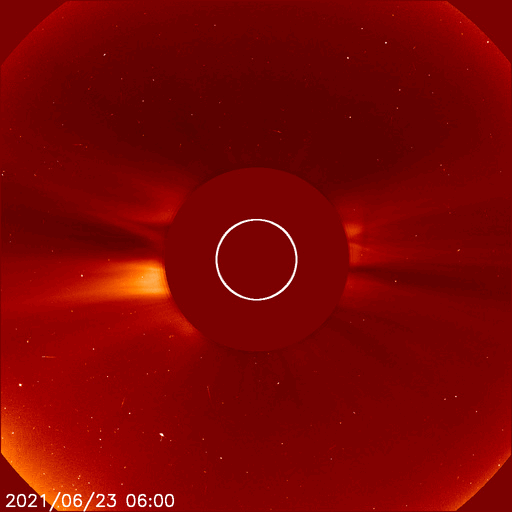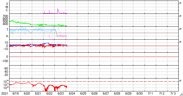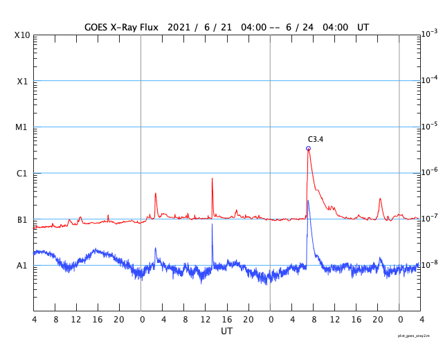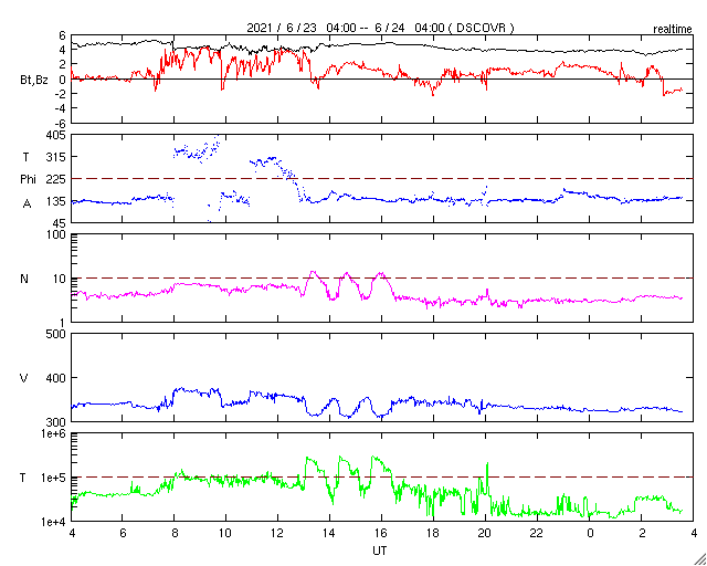 2021/ 6/24 12:42 更新 C3.4の小規模フレアが発生しました。低速の太陽風が続いています。 担当 篠原 昨日の午後、23日16時(世界時23日7時)に、 太陽の北東の端(左上)の少し向こう側でフレアが発生しました。 GOES衛星のX線強度では、 C3.4の小規模フレアとなっていますが、 実際の規模はこれよりも大きかった可能性があります。 SDO衛星AIA131、193による動画を掲載します。 フレアで明るく輝く瞬間は、 太陽の端よりも少し向こうで発生し、 その後、ポストフレアループの領域が 次第にこちら側に回ってきている様に見えます。 このフレアに伴って、 CME(コロナ質量放出)が太陽の左に向かって発生しています。 SOHO衛星LASCO C2、C3の動画を掲載します。 地球に対して横向きの噴出なので、影響はないでしょう。 現在の太陽の可視光写真では、 太陽の東端近く(左端)の南北両側に白斑がありますが、 黒点は見えていません。 太陽風は、速度が350km/秒から320km/秒へ少し下がっています。 磁場強度は4nT前後と平均的な状態です。 磁場の南北成分は、全体としては弱い北寄りで、 速度が下がっていることもあり、 磁気圏は穏やかな状態が続いています。 AE指数はほとんど変化がありません。 SDO衛星AIA193では、太陽の中心部にコロナホールはなく、 低速の太陽風がこのまま続きそうです。 ![]() 太陽の北東の端で発生したC3.4の小規模フレア。SDO衛星AIA131、193。 (c) SDO (NASA)、(動画加工 : 宇宙天気ニュース) ![]() C3.4のフレアに伴って発生したCME。SOHO衛星LASCO C2、C3。 (c) SOHO (ESA & NASA)、 (動画加工 : 宇宙天気ニュース) ![]() SDO衛星のAIA193カメラによる太陽コロナの様子 (c) SDO (NASA) ![]() SDO衛星による太陽の可視光写真。マウスの矢印を写真に重ねると、黒点番号付きの写真に切り替わります。 (c) SDO (NASA) ![]() GOES衛星の太陽X線強度。赤・橙 = 0.1〜0.8 nm、青・紫 = 0.05〜0.4 nm (c) データ:NOAA/SWPC、作図:宇宙天気ニュース ![]() DSCOVRが観測した太陽風の磁場(1番上の枠、黒線は全体の強度、赤線は南北成分) および、太陽風の密度(3番目の紫線)、速度(4番目の青線) (c) データ:NOAA/SWPC、作図:宇宙天気ニュース ![]() AE指数(速報値) 下段のAEグラフの値が高くなると、オーロラ活動が活発化しています。 (c) 京都大学WDC ![]() ![]() 27日の太陽周期に合わせたデータプロット 太陽が同じ面を地球に向けていた27日前の変化から、今後を予想することができます。 (c) 作図:宇宙天気ニュース