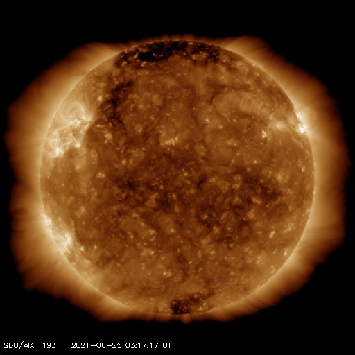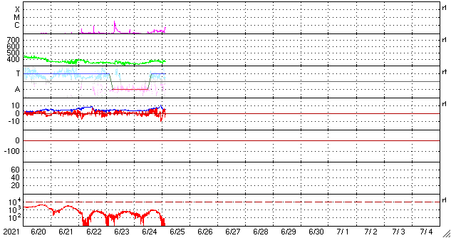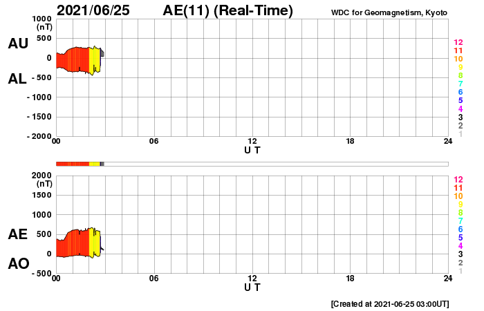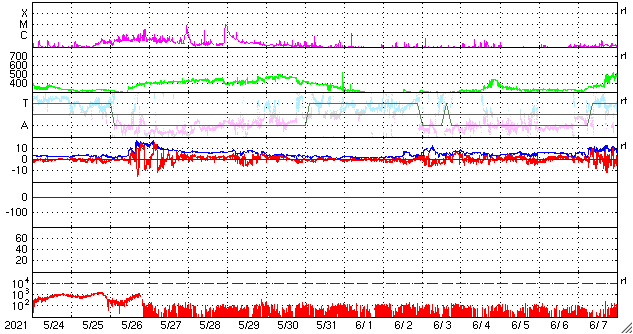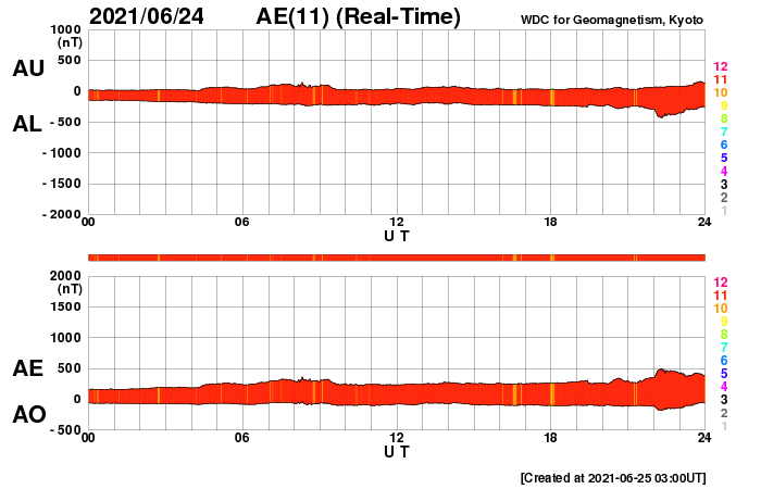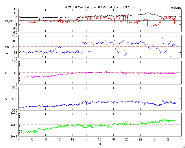 2021/ 6/25 12:27 更新 太陽風は低速で、磁気圏も穏やかです。新しい黒点が現れました。 担当 篠原 太陽風は、320km/秒から360km/秒へ 少し速度が上がっていますが、 低速の状態が続いています。 磁場強度は、4nTの状態から、 一時的に10nTへ強まる変化が起きていますが、 現在は5nTと平均的な値に戻っています。 磁場の南北成分は、 磁場が強まった頃に南向きに強まる変化が発生していますが、 その他は、0nT付近か北寄りの傾向です。 磁気圏は基本的に穏やかで、 AE指数は、グラフの最後に高まりがある程度です。 SDO衛星AIA193は、 太陽の北東側(左上)にコロナホールが少し見えています。 この広がりだと影響は小さそうです。 太陽風は、穏やかな風が続きそうです。 太陽は、南東の端(左下)から新しい黒点が姿を現しています。 今のところ、特に活動的な様子はありません。 X線グラフは、最後にB クラスの小さいフレアが発生しています。 これは、太陽の北西の端(右上)の2833黒点群で発生しています。
