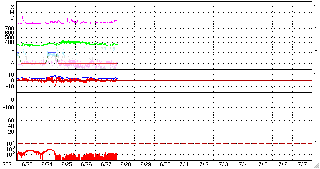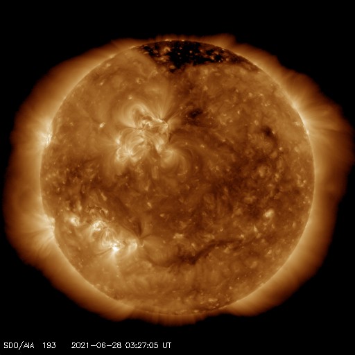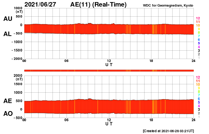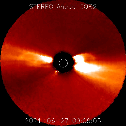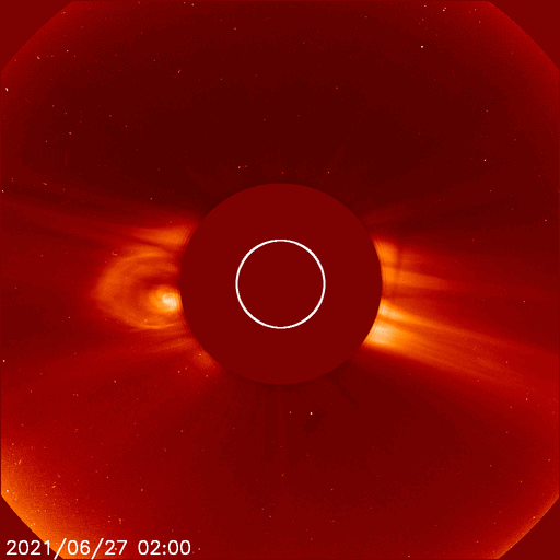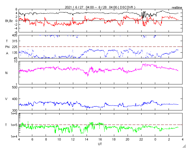2021/ 6/28 12:38 更新 太陽風は低速の状態が続いています。太陽の東端に黒点が現れています。 担当 篠原 太陽風は、350km/秒前後の低速の風が続いています。 磁場強度は、4nTと平均的な状態で安定しています。 AE指数は、グラフが太くなっているため 細かい変化は分かりませんが、 磁気圏は穏やかに推移している様です。 SDO衛星AIA193では、 太陽の中心部にコロナホールは見られず、 北極寄りに淡いコロナホールが見えるくらいです。 太陽風は、基本的には穏やかな風が続きそうです。 太陽は、南東に現れた黒点に、 2836群と番号が付けられています。 また、北東の端(左上)から新しい黒点が現れています。 X線グラフは、Bクラスの小さい変化が起きている程度で、 穏やかです。 SOHO衛星LASCO C2、C3によると、 昨日の午後、27日15時(世界時27日5時)頃に、 太陽の右に向かってCME(コロナ質量放出)が発生しています。 太陽を左斜めから観測している STEREO Ahead衛星COR2とともに、動画を掲載します。 SDO衛星AIA193を見ると、 西の端(右端)でコロナが動く様子が見られるので、 この活動によるCMEかもしれません。 ![]() 太陽の右に向かって飛び出すCME。SOHO衛星LASCO C2、C3。 (c) SOHO (ESA & NASA)、 (動画加工 : 宇宙天気ニュース) ![]() 太陽を左斜めから観測しているSTEREO Ahead衛星COR2によるCME。 (c) STEREO (NASA)、 (動画加工 : 宇宙天気ニュース) ![]() SDO衛星のAIA193カメラによる太陽コロナの様子 (c) SDO (NASA) ![]() SDO衛星による太陽の可視光写真。マウスの矢印を写真に重ねると、黒点番号付きの写真に切り替わります。 (c) SDO (NASA) ![]() DSCOVRが観測した太陽風の磁場(1番上の枠、黒線は全体の強度、赤線は南北成分) および、太陽風の密度(3番目の紫線)、速度(4番目の青線) (c) データ:NOAA/SWPC、作図:宇宙天気ニュース ![]() AE指数(速報値) 下段のAEグラフの値が高くなると、オーロラ活動が活発化しています。 (c) 京都大学WDC ![]() ![]() 27日の太陽周期に合わせたデータプロット 太陽が同じ面を地球に向けていた27日前の変化から、今後を予想することができます。 (c) 作図:宇宙天気ニュース