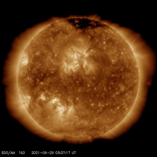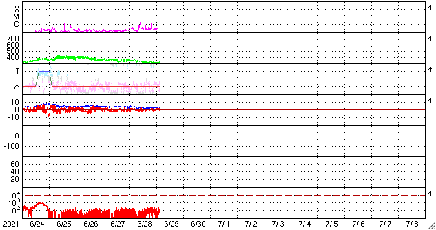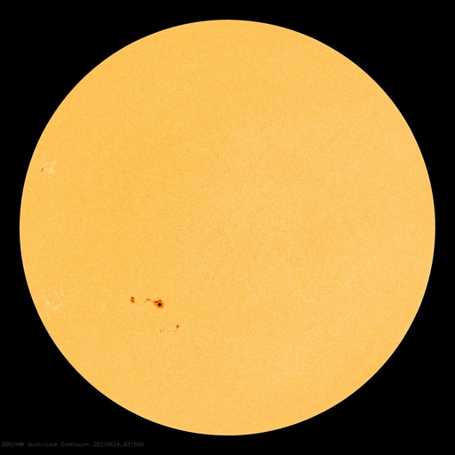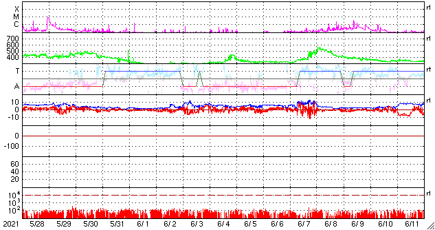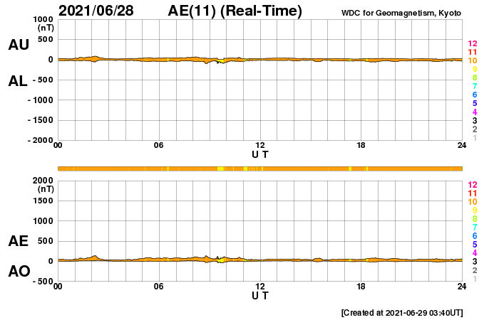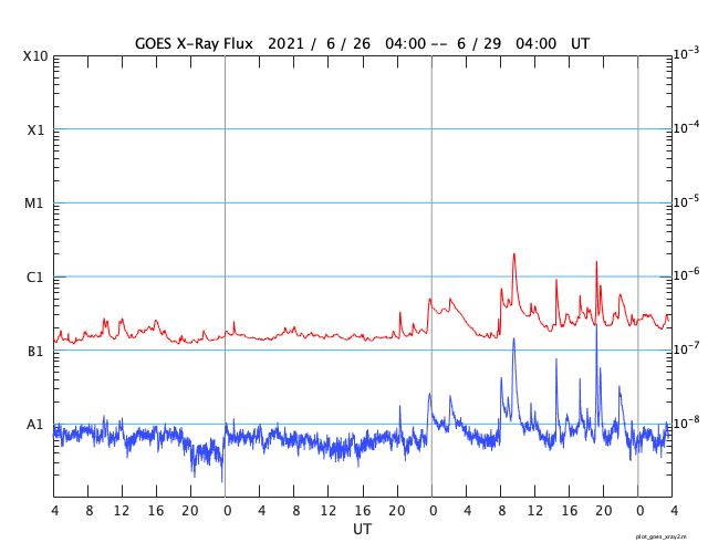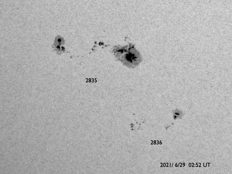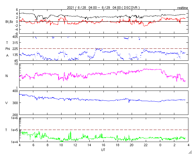 2021/ 6/29 12:46 更新 Cクラスの小規模フレアが発生しました。太陽風は更に低速になっています。 担当 篠原 太陽の南半球の2835黒点群と2836黒点群の活動がやや高まり、 昨夕、28日18時(世界時28日9時)に2836群でC2.0、 今朝早く、29日4時(世界時28日19時)に2835群でC1.6 の小規模フレアがそれぞれ発生し、 その前後にBクラスの小さいフレアも複数回発生しています。 2つの黒点群の拡大写真を掲載します。 2835群は、昨日よりも黒点が増えています。 この後の活動に注目して下さい。 太陽では、北東の端に現れた黒点に、 2837群と番号が付けられています。 太陽風は、速度が320km/秒へ下がり、 更に低速の風になっています。 磁場強度は、3nTとやや弱くなっています。 磁気圏は静穏で、 AE指数はほとんど変化のない状態です。 SDO衛星AIA193では、 太陽の中心部から東側(左側)にかけてコロナホールは見られず、 この後も穏やかな太陽風が続きそうです。 ![]() SDO衛星による2835、2836黒点群の拡大写真。 (c) SDO (NASA)、作図:宇宙天気ニュース ![]() SDO衛星のAIA193カメラによる太陽コロナの様子 (c) SDO (NASA) ![]() SDO衛星による太陽の可視光写真。マウスの矢印を写真に重ねると、黒点番号付きの写真に切り替わります。 (c) SDO (NASA) ![]() GOES衛星の太陽X線強度。赤・橙 = 0.1〜0.8 nm、青・紫 = 0.05〜0.4 nm (c) データ:NOAA/SWPC、作図:宇宙天気ニュース ![]() DSCOVRが観測した太陽風の磁場(1番上の枠、黒線は全体の強度、赤線は南北成分) および、太陽風の密度(3番目の紫線)、速度(4番目の青線) (c) データ:NOAA/SWPC、作図:宇宙天気ニュース ![]() AE指数(速報値) 下段のAEグラフの値が高くなると、オーロラ活動が活発化しています。 (c) 京都大学WDC ![]() ![]() 27日の太陽周期に合わせたデータプロット 太陽が同じ面を地球に向けていた27日前の変化から、今後を予想することができます。 (c) 作図:宇宙天気ニュース