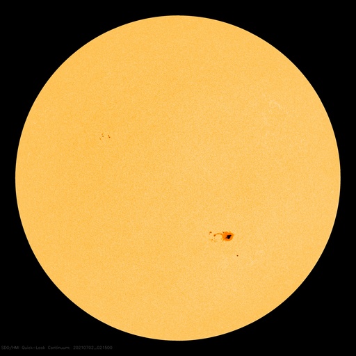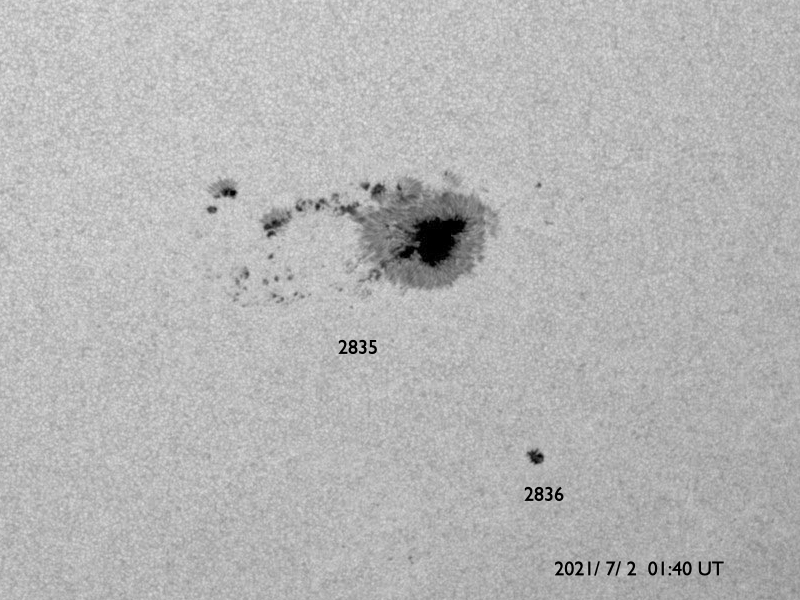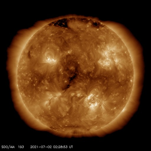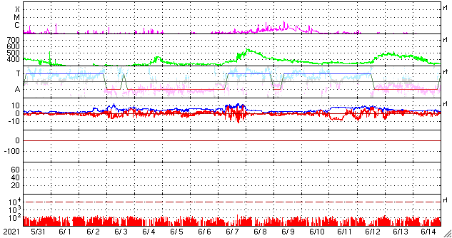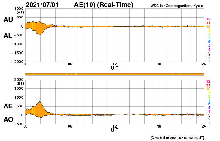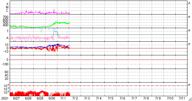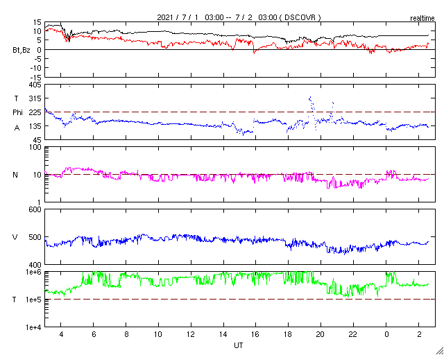 2021/ 7/ 2 11:43 更新 高速風の速度は少し下がっています。磁気圏は穏やかです。 担当 篠原 太陽風の速度は、 昨夜までは500km/秒付近を保っていましたが、 今日に入ると少し下がって、 現在は480km/秒とやや高速の状態です。 磁場強度も、10nTから7nTへ次第に低下しています。 磁場の南北成分は、 昨日のニュース以降、弱い北寄りが続いています。 このため、磁気圏は穏やかになっていて、 AE指数はほとんど変化がありません。 この後、29日に発生した弱いCMEの乱れが到来して、 太陽風磁場の強まりが見られるかもしれません。 SDO衛星AIA193では、 太陽の中心にコロナホールが見えています。 広がりは小さいですが、 3日後くらいに太陽風の速度が高まるかもしれません。 太陽は、2835黒点群が大きな姿を保っていますが、 X線グラフは、Bクラスの小さい変化が起きている程度です。 他の黒点群も含め、 太陽全体としてはやや落ち着いた状態です。