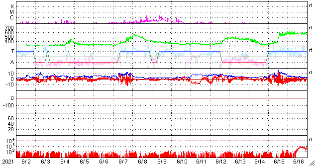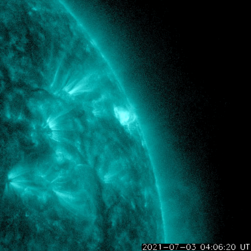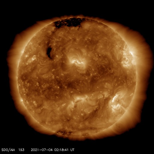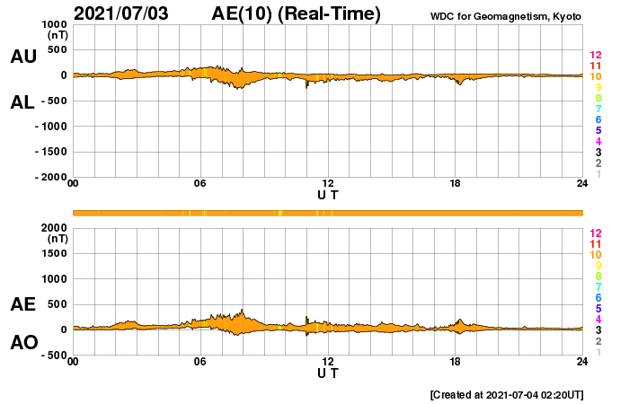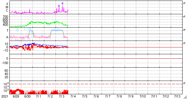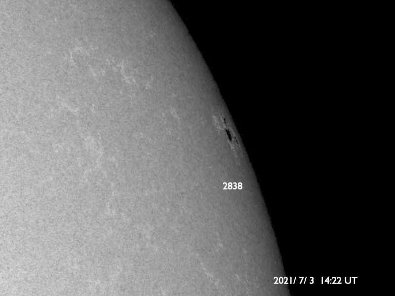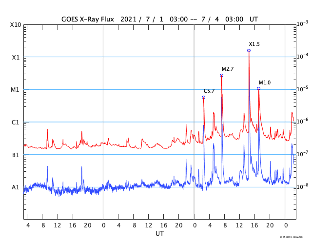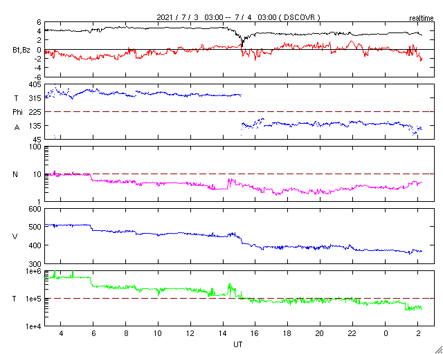 2021/ 7/ 4 11:29 更新 X1.5の大規模フレアが発生しました。 担当 篠原 昨夜遅く、3日23時半(世界時3日14時半)に、 太陽の北西端近く(右上)の2838黒点群で、 X1.5の大規模フレアが発生しました。 SDO衛星AIA131による動画を掲載します。 Xフレアの発生は、 2017年9月10日(世界時)に発生したX8.2以来で、 3年10か月ぶりです。 現在の第25活動周期では初めてのXクラスです。 2838黒点群は、 その前後にM2.7とM1.0の中規模フレアも起こしています。 (動画はこのフレアも含めています) 2838黒点群は、Xフレアが発生した頃には、 西の端ぎりぎりに達していました。 SDO衛星による拡大写真を掲載します。 現在は太陽の向こう側に回ってしまい、 地球からは見えなくなっています。 現在の太陽面では、 南西(右下)の2836群がほとんど見えなくなっています。 一方、北東(左上)に小さい黒点が現れています。 2838群が沈んだので、活動は穏やかになりそうです。 太陽風は、昨日の午後から速度が下がり始め、 今日に入る頃に400km/秒台を割り、 現在は370km/秒と低速の風に変わっています。 磁場強度は、4nTから3nTへ少し下がり、 やや弱くなっています。 磁気圏は概ね静穏で、 AE指数は時々小さい変化が見られる程度です。 SDO衛星AIA193の太陽コロナ写真では、 太陽の北東に北極から縦にコロナホールが伸びています。 東西の広がりは小さいので、 影響は限定的になりそうです。 ![]() X1.5の大規模フレアとその前後のM2.7、M1.0フレア。SDO衛星AIA131。 (c) SDO (NASA)、(動画加工 : 宇宙天気ニュース) ![]() Xフレアを起こした頃の2838黒点群。SDO衛星。 (c) SDO (NASA)、作図:宇宙天気ニュース ![]() SDO衛星のAIA193カメラによる太陽コロナの様子 (c) SDO (NASA) ![]() SDO衛星による太陽の可視光写真。マウスの矢印を写真に重ねると、黒点番号付きの写真に切り替わります。 (c) SDO (NASA) ![]() GOES衛星の太陽X線強度。赤・橙 = 0.1〜0.8 nm、青・紫 = 0.05〜0.4 nm (c) データ:NOAA/SWPC、作図:宇宙天気ニュース ![]() DSCOVRが観測した太陽風の磁場(1番上の枠、黒線は全体の強度、赤線は南北成分) および、太陽風の密度(3番目の紫線)、速度(4番目の青線) (c) データ:NOAA/SWPC、作図:宇宙天気ニュース ![]() AE指数(速報値) 下段のAEグラフの値が高くなると、オーロラ活動が活発化しています。 (c) 京都大学WDC ![]() ![]() 27日の太陽周期に合わせたデータプロット 太陽が同じ面を地球に向けていた27日前の変化から、今後を予想することができます。 (c) 作図:宇宙天気ニュース