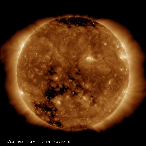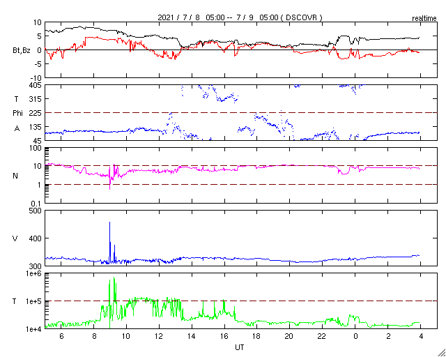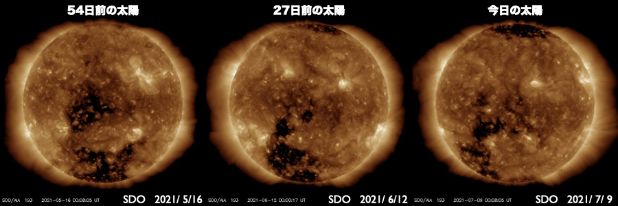 2021/ 7/ 9 13:03 更新 低速の太陽風が続いています。磁気圏も穏やかです。 担当 篠原 太陽風は、320km/秒前後の低速の風が続いています。 磁場強度は、7nTから2nTへ下がり、 最後は4nTと平均的な状態です。 太陽風は穏やかな状態が続いています。 磁気圏も静穏で、 AE指数は小さい変化が見られる程度です。 SDO衛星AIA193では、 南東側(左下)にコロナホールが大きく広がっています。 1枚目の図で、過去2周期の様子と比較します。 すると、同じ様な広がりが続いていることが分かります。 太陽風も同様で、過去の周期では、 5月20日と6月15日から高速風が始まっています。 今回も同様とすると、 7月12〜13日頃から速度が高まるかもしれません。 一方、27日周期の図を見ると、 前周期の太陽風では、 その前の6月12日にも速度の高まりが到来しています。 これから、この変化の回帰に相当する高まりが始まるでしょうか。 太陽は、南東の端(左下)から新しい黒点が現れています。 2839群は、小さい黒点が見えるだけです。 X線グラフでは、後半にBクラスの小さい変化が続いていますが、 これは、北西の端に沈んだ2840群で起きています。 現在は見えなくなったので、この後は静かになりそうです。 ![]() 2周期前(54日前)、1周期前(27日前)、現在のコロナホールの様子。SDO衛星AIA193。 (c) SDO (NASA)、作図:宇宙天気ニュース ![]() SDO衛星のAIA193カメラによる太陽コロナの様子 (c) SDO (NASA) ![]() SDO衛星による太陽の可視光写真。マウスの矢印を写真に重ねると、黒点番号付きの写真に切り替わります。 (c) SDO (NASA) ![]() DSCOVRが観測した太陽風の磁場(1番上の枠、黒線は全体の強度、赤線は南北成分) および、太陽風の密度(3番目の紫線)、速度(4番目の青線) (c) データ:NOAA/SWPC、作図:宇宙天気ニュース ![]() AE指数(速報値) 下段のAEグラフの値が高くなると、オーロラ活動が活発化しています。 (c) 京都大学WDC ![]() ![]() 27日の太陽周期に合わせたデータプロット 太陽が同じ面を地球に向けていた27日前の変化から、今後を予想することができます。 (c) 作図:宇宙天気ニュース