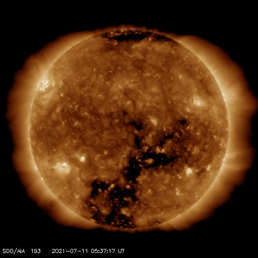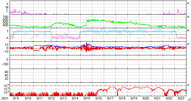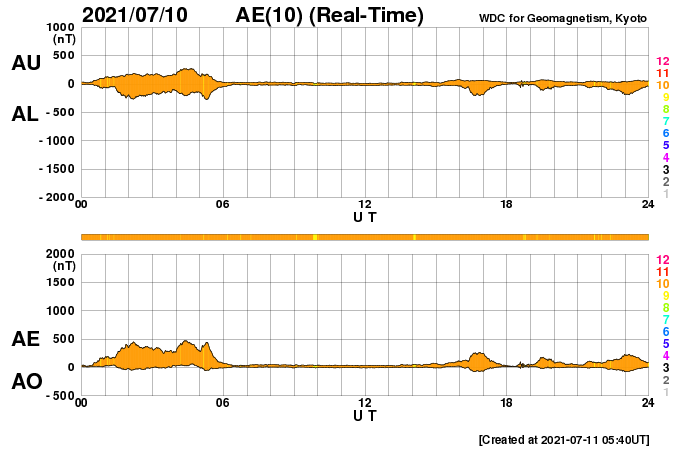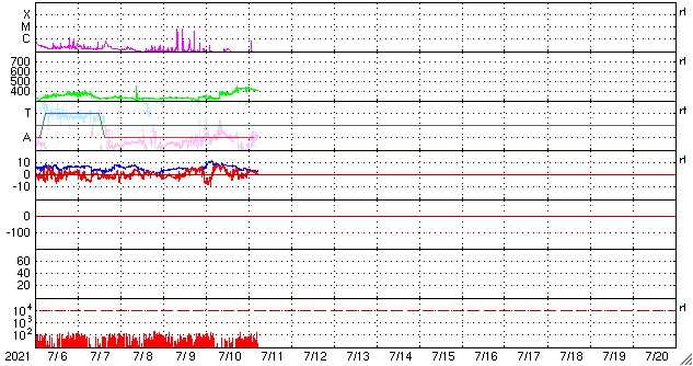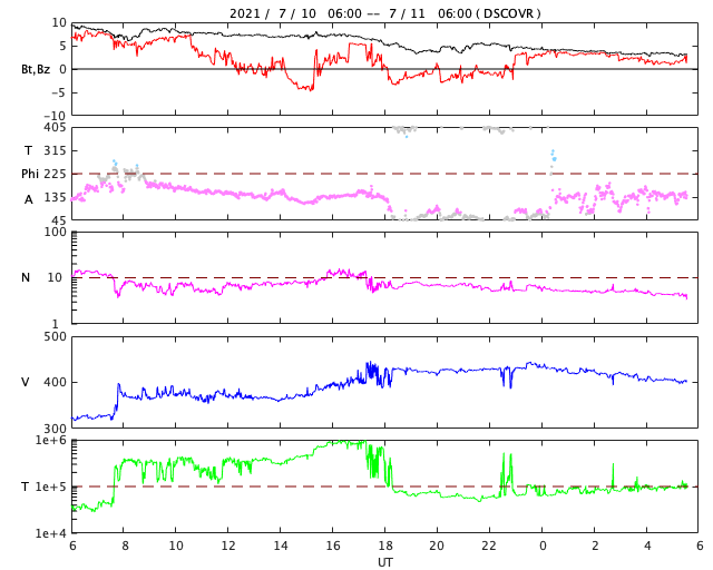 2021/ 7/11 14:46 更新 太陽風は平均的な速度です。太陽の北東に黒点が現れています。 担当 篠原 太陽風の速度は、今日未明に430km/秒に高まり、 平均的な速さに戻っています。 現在は400km/秒と少し下がっています。 10nTに強まっていた磁場強度は、 速度と反対に次第に下がり、3nTとやや弱くなっています。 磁場の南北成分は、一時的に南向きに変化する程度です。 AE指数は、最初に昨日のニュースの頃の変化が残っていますが、 その後は小さい変化が見られるくらいで、 磁気圏は概ね静穏です。 SDO衛星AIA193では、コロナホールが西に進んでいます。 27日周期の図の前周期に見られる様に、 太陽風速度の高まりが明日くらいから始まりそうです。 太陽は、北東(左上)から新しい黒点が現れて、 2842群と番号が付けられています。 フレアは、南東(左下)の2841群で B7の小さい変化が発生している程度で、 太陽は穏やかです。