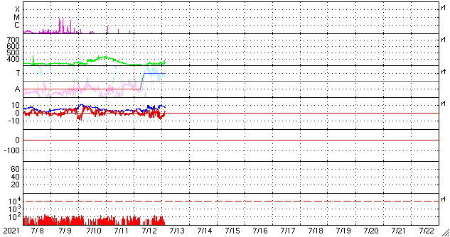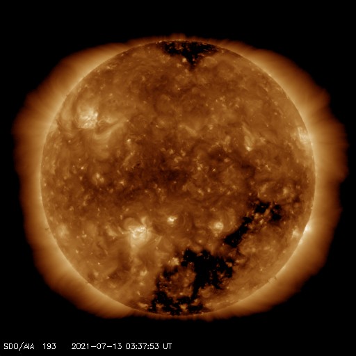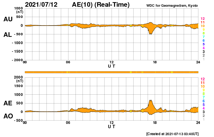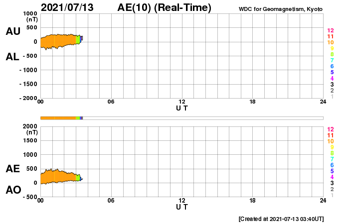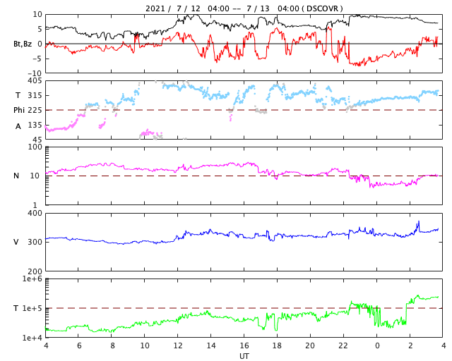 2021/ 7/13 12:52 更新 太陽風は低速の状態が続いています。 担当 篠原 太陽風は、300km/秒から340km/秒へ 速度が少し変化しただけで、 低速の状態が続いています。 27日周期の図を見ると、 前周期の太陽風は既に500km/秒台に高まっていますが、 今回は変化が遅れている様です。 磁場強度は、5〜10nTの間を変化しています。 強まるというほどの変化でもなく、 今後の推移に注目しているところです。 磁場の南北成分は、 グラフの中盤から南向きに強まる変化が見られています。 速度が下がっているので、磁気圏への影響は限定的ですが、 AE指数は500nT前後の変化が度々発生しています。 SDO衛星AIA193では、 南半球のコロナホールが西に進んでいます。 これから太陽風に変化が発生するでしょうか。 太陽は、2841群がだいぶ小さくなっています。 X線グラフも特に変化はありません。 一方、太陽の向こう側では活動が続いている様で、 SOHO衛星LASCO C2では、 左右両方にCMEの噴出が発生しています。 ![]() SDO衛星のAIA193カメラによる太陽コロナの様子 (c) SDO (NASA) ![]() SDO衛星による太陽の可視光写真。マウスの矢印を写真に重ねると、黒点番号付きの写真に切り替わります。 (c) SDO (NASA) ![]() DSCOVRが観測した太陽風の磁場(黒線は全体の強度、赤線は南北成分) 磁場の向き、プラズマの密度、速度、温度 (c) データ:NOAA/SWPC、作図:宇宙天気ニュース ![]() AE指数(速報値) 下段のAEグラフの値が高くなると、オーロラ活動が活発化しています。 (c) 京都大学WDC ![]() ![]() 27日の太陽周期に合わせたデータプロット 太陽が同じ面を地球に向けていた27日前の変化から、今後を予想することができます。 (c) 作図:宇宙天気ニュース