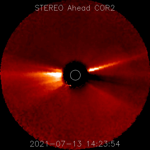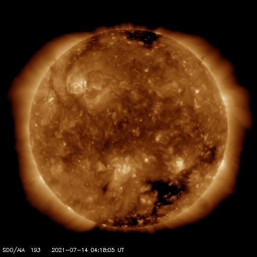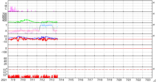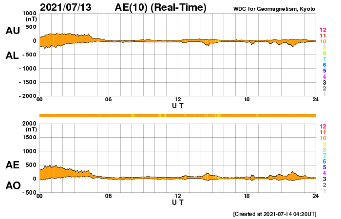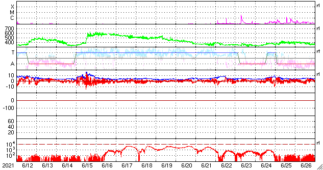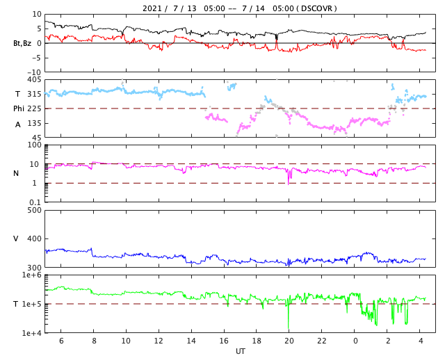 2021/ 7/14 13:31 更新 太陽風は低速の風が続いています。太陽の向こう側でCMEが発生しています。 担当 篠原 太陽風は、330km/秒前後と低速の風が続いています。 磁場強度も5nTから3nTへ下がり、やや弱くなっています。 SDO衛星AIA193の太陽コロナ写真で 南半球に広がっているコロナホールの影響は、 到来しないまま推移しています。 27日周期の図を見ると、 前周期の高速風の到来のタイミング(6月15日)から 2日近く過ぎています。 このまま低速の状態が続くのか、 これから速度の高まりが始まるのか、 引き続き注目してください。 コロナホールの広がりから考えると、 ある程度の影響は来る様に思うのですが。 磁気圏は静穏で、 AE指数は小さい変化が見られる程度です。 太陽は、向こう側で活発な活動が続いています。 昨日もCME(コロナ質量放出)のことを書きましたが、 今朝も規模の大きいCMEが発生しています。 太陽を左斜めから観測しているSTEREO Ahead衛星の COR2による動画を掲載します。 地球側の太陽面では、 2841黒点群は見えなくなり、 南西側(右下)と2842群の左側に新しい黒点が現れています。 X線グラフは、 Bクラスの小さい変化が1回起きているだけです。 ![]() 太陽の向こう側で発生したCME。STEREO Ahead衛星COR2。 (c) STEREO (NASA)、 (動画加工 : 宇宙天気ニュース) ![]() SDO衛星のAIA193カメラによる太陽コロナの様子 (c) SDO (NASA) ![]() SDO衛星による太陽の可視光写真。マウスの矢印を写真に重ねると、黒点番号付きの写真に切り替わります。 (c) SDO (NASA) ![]() DSCOVRが観測した太陽風の磁場(黒線は全体の強度、赤線は南北成分) 磁場の向き、プラズマの密度、速度、温度 (c) データ:NOAA/SWPC、作図:宇宙天気ニュース ![]() AE指数(速報値) 下段のAEグラフの値が高くなると、オーロラ活動が活発化しています。 (c) 京都大学WDC ![]() ![]() 27日の太陽周期に合わせたデータプロット 太陽が同じ面を地球に向けていた27日前の変化から、今後を予想することができます。 (c) 作図:宇宙天気ニュース