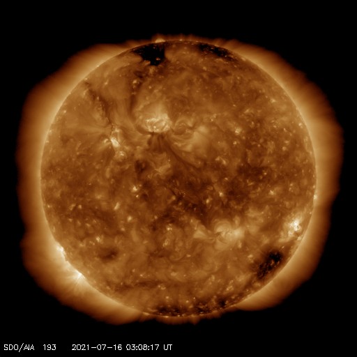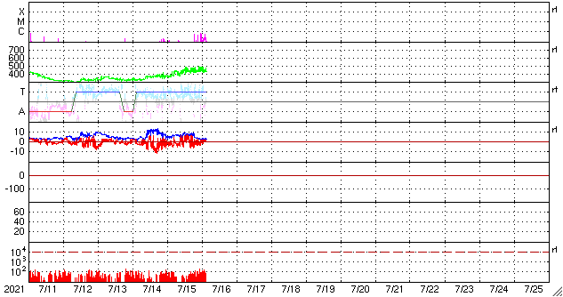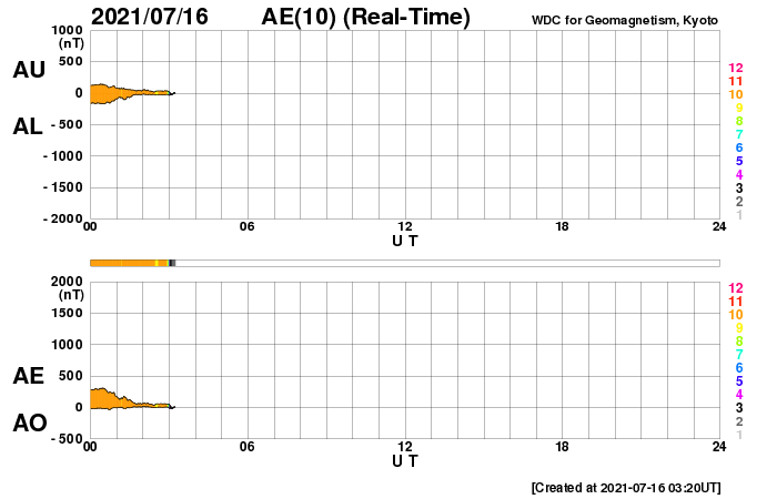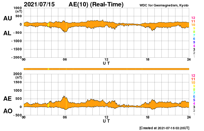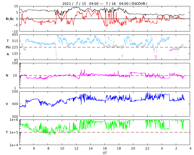 2021/ 7/16 12:20 更新 太陽風の速度が少し高まりまっています。 担当 篠原 昨日のニュースの後、 太陽風の速度は400km/秒台に上がり、 以降、430〜450km/秒付近で推移しています。 (速度のデータがやや不安定になっています) コロナホールによる太陽風速度の高まりが、 遅れてやって来たということでしょうか。 磁場強度は、 今日未明までは7nT前後と少し強まっていましたが、 現在は3nTとやや弱くなっています。 このため、速度の高まりはこのくらいまでになりそうです。 SDO衛星AIA193を見ると、 南半球のコロナホールは既に西の端近くまで進んでいます。 太陽風速度の高まりは、あまり長く続かないでしょう。 その後は、穏やかな太陽風になりそうです。 太陽風磁場の南北成分は、比較的南寄りに推移して、 磁気圏の活動もある程度高まりました。 AE指数は、300〜500nTの小規模の変化が、 連続的に発生しています。 現在の磁場は、強度は下がり、 南北成分は0nT付近で変化しています。 このため、磁気圏もこの後は穏やかになりそうです。 太陽は、南東の端(左下)から新しい黒点が現れています。 X線グラフが後半で高まり、 Bクラスの小さいフレアが続いています。 これは、南西(右下)の2843黒点群の活動が やや高まっているためです。 この後、西の端に沈んで行きますが、 それまでにどのような活動が見られるでしょうか。 太陽の向こう側では活動が続いています。 15日にもCME(コロナ質量放出)が発生しています。
