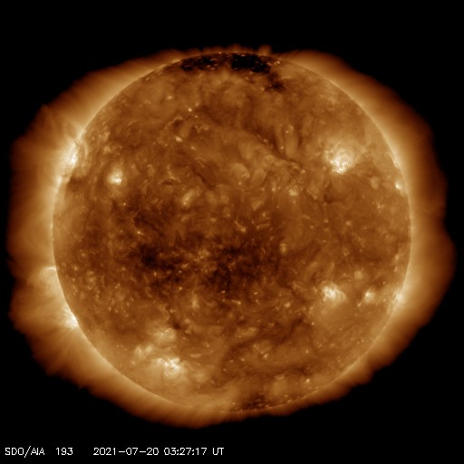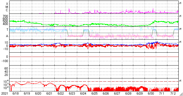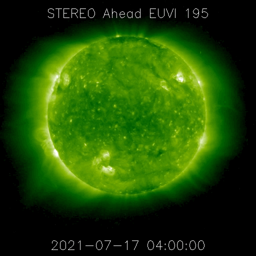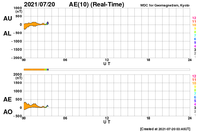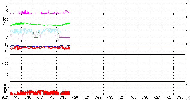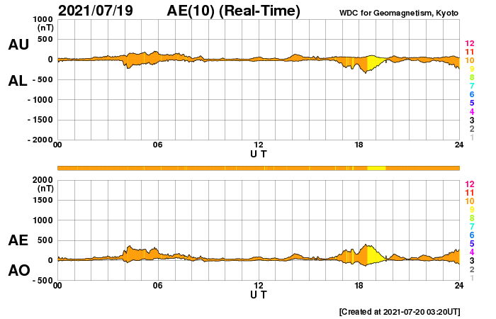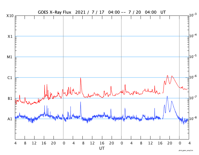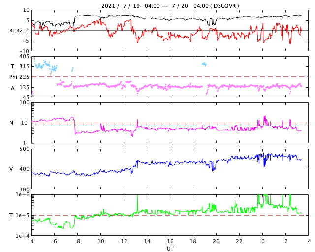 2021/ 7/20 12:38 更新 太陽の南東の端から活動的な領域が近づいています。太陽風の速度は少し高まっています。 担当 篠原 17日と18日のニュースで紹介した 太陽の向こう側で発生したCME(コロナ質量放出)について、 STEREO Ahead衛星による動画を紹介します。 1枚目は、世界時15日21時頃に発生したフレアとCMEの様子です。 EUVI 195とCOR2を繋げて動画にしています。 SOHO衛星で見えていた激しいガスの噴出を、 少し横向きから見ています。 この現象が地球側で発生していた場合、 どのような規模のフレアと太陽風の乱れになっていたでしょうか。 2枚目は、世界時17日5時頃のフレアとCMEです。 COR2の画像は枚数がまだ少なく、粗い動画になっています。 この動画では、EUVI 195(緑色の写真)で、 フレアの後にコロナのガスの乱れが 太陽の手前側に広がる様子が印象的です。 これらの活動を起こした領域が、 太陽のこちら側に近付いています。 今日のX線グラフでは、 グラフの最後にC1に達する時間幅の広いフレアが発生しています。 このフレアは、まだ太陽の南西の端(左下)の向こう側にある、 2つの動画のフレアを起こした領域によるものです。 今後の活動に注目して下さい。 現在の太陽は、 北東の端(左上)に現れた黒点に2846群と番号が付き、 南半球の高い緯度の2844群は見えなくなっています。 南東の端(左下)には白斑が見え始めていて、 この後、黒点も姿を現すかもしれません。 太陽風は、昨夜くらいから速度が上昇を始め、 現在は460km/秒と少し高まっています。 磁場強度は、昨夜以降、7nT前後と少し強まっています。 このまま更に速度は高まるのでしょうか。 SDO衛星AIA193では、 コロナホールは特に見られなかったのですが、 今後の速度の変化に注目して下さい。 磁場の南北成分は、比較的南寄りで推移しています。 磁気圏では小規模の活動が起きている様で、 AE指数は300nT程度の変化が数回発生しています。 今後速度が更に高まれば、 磁気圏活動の規模もより大きくなるでしょう。