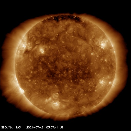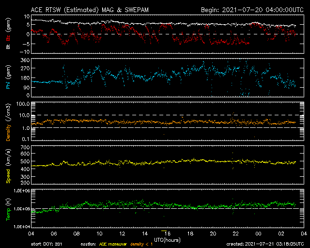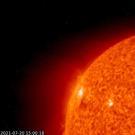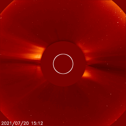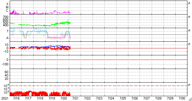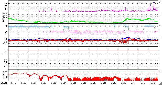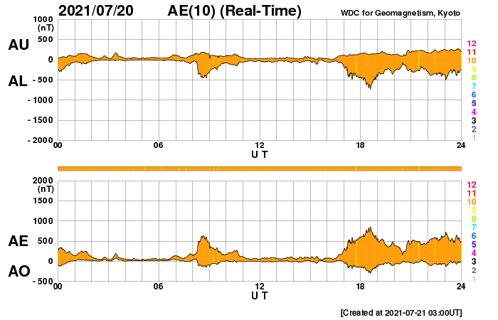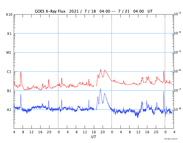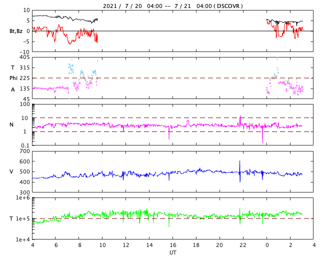 2021/ 7/21 12:18 更新 太陽風の速度が500km/秒に高まっています。 担当 篠原 今日未明、21日1時(世界時20日16時)に、 太陽の北東側(左上)の2846黒点群付近で B5.4の小さいフレアが発生しました。 GOES衛星SUVI 304の動画を掲載します。 小さい規模の活動ですが、 コロナが噴き上がる様子が見事です。 SOHO衛星LASCO C2、C3では、 CME(コロナ質量放出)も観測されています。 地球に対しては斜め方向なので、影響はなさそうです。 太陽では、南東の端(左下)から黒点が現れ、 2847群と番号が付けられています。 太陽の向こう側で活発に活動していた領域は、 この黒点のさらに向こう側です。 この後姿を現すでしょう。 また、北東(左上)の2846群の右に 新しい黒点が現れています。 太陽風は、速度が500k/秒まで高まって高速風になっています。 (グラフの最後は480km/秒へ少し下がっています) 磁場強度は、昨日の7nTから現在は5nTへ少し下がり、 平均的な状態です。 SDO衛星AIA193では、 太陽風は穏やかな状態が続きそうだったのですが、 この後はどの様な推移になるでしょうか。 DSCOVR衛星のグラフでは磁場の変化が欠けていますが、 ACE衛星のグラフを見ると、 この頃に磁場の南北成分が南寄りになっていました。 このため磁気圏の活動が高まって、 AE指数で500nT前後の中規模の変化がしばらく発生しています。 太陽風のグラフの最後では、磁場の南北成分は0nT付近です。 このため、磁気圏の活動は小さくなりそうです。