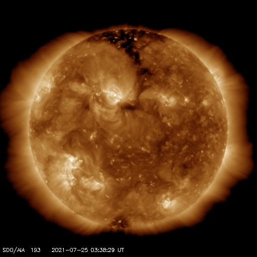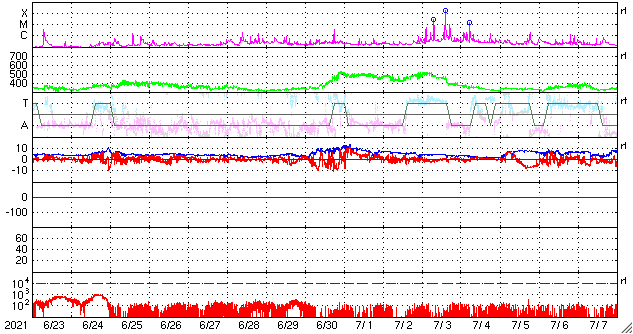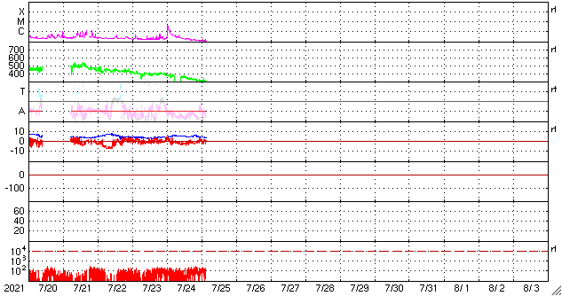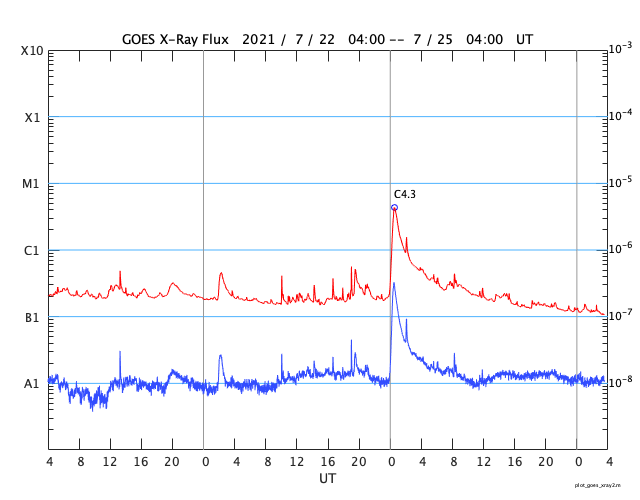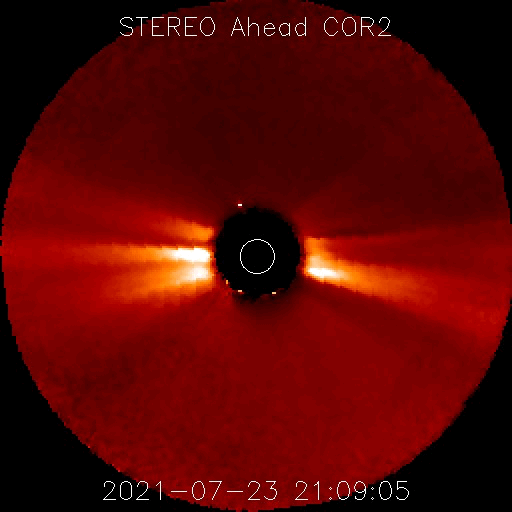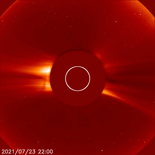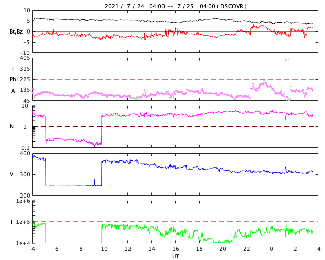 2021/ 7/25 12:49 更新 太陽は穏やかです。太陽風は低速になっています。 担当 篠原 昨日紹介したCME(コロナ質量放出)の動画を、 SOHO衛星LASCO C2、C3の画像で作成しました。 太陽の左に向かってコロナのガスが飛び出しています。 C4.3フレアが南寄りの場所で発生したのに対し、 CMEは左横に向かって飛び出しているのが気になったのですが、 発生のタイミングがほぼ一致しているので、 C4.3フレアに関係するCMEと言えそうです。 STEREO Ahead衛星COR2による動画も、 写真が更新されたので、昨日よりも長い時間幅で紹介します。 太陽を囲むように広がっているように感じられますが、 高画質になった頃に再び見てみたい状態です。 SOHO衛星LASCO C3(青い写真)では、 太陽の左に、かに座の四角の星の並びと、 その中心にプレセペ星団が見えています。 少しずつ太陽に近付いています。 現在の太陽面は、北半球は2846黒点群、 南半球は2847群だけになっています。 X線グラフの変化はなく、太陽は穏やかです。 太陽風は、速度が300km/秒へ下がり、 完全に低速の状態になっています。 磁場強度は、5nTから4nTへ少し下がっていますが、 平均的な状態です。 磁場の南北成分は、 今朝にかけて弱い南寄りの傾向が続き、 AE指数は小規模の変化が繰り返し発生しています。 現在は、南北成分は0nT付近で変化する様になり、 速度も下がってしまったので、 今後の磁気圏は静かな状態になりそうです。