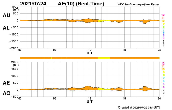 (c) SOHO (ESA & NASA)、 (動画加工 : 宇宙天気ニュース) ![]() STEREO Ahead衛星COR2による昨日のCME。 (c) STEREO (NASA)、 (動画加工 : 宇宙天気ニュース) ![]() SDO衛星のAIA193カメラによる太陽コロナの様子 (c) SDO (NASA) ![]() SDO衛星による太陽の可視光写真。マウスの矢印を写真に重ねると、黒点番号付きの写真に切り替わります。 (c) SDO (NASA) ![]() GOES衛星の太陽X線強度。赤・橙 = 0.1〜0.8 nm、青・紫 = 0.05〜0.4 nm (c) データ:NOAA/SWPC、作図:宇宙天気ニュース ![]() DSCOVRが観測した太陽風の磁場(黒線は全体の強度、赤線は南北成分) 磁場の向き、プラズマの密度、速度、温度 (c) データ:NOAA/SWPC、作図:宇宙天気ニュース ![]() AE指数(速報値) 下段のAEグラフの値が高くなると、オーロラ活動が活発化しています。 (c) 京都大学WDC ![]() ![]() 27日の太陽周期に合わせたデータプロット 太陽が同じ面を地球に向けていた27日前の変化から、今後を予想することができます。 (c) 作図:宇宙天気ニュース