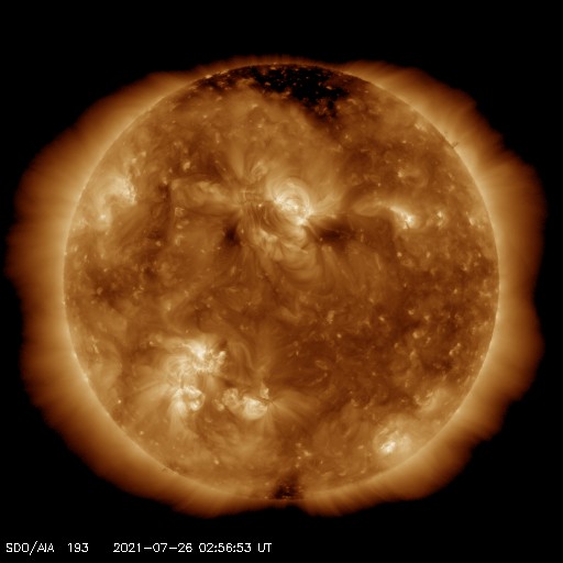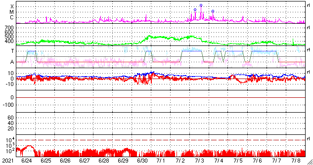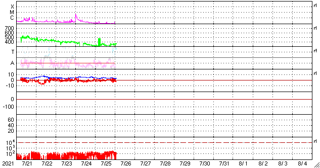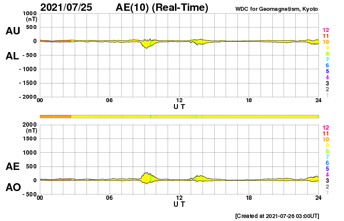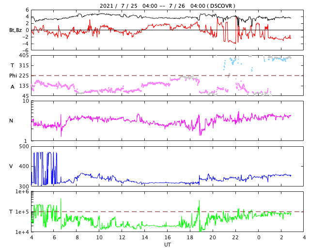 2021/ 7/26 12:09 更新 低速の太陽風が続いています。太陽は穏やかです。 担当 篠原 太陽風の速度は、 300km/秒から350km/秒へ少し上がっていますが、 低速の状態が続いています。 磁場強度は、3〜5nTの間を推移していて、 平均的な状態です。 磁気圏は穏やかで、 AE指数は時々小規模の変化が発生する程度です。 SDO衛星AIA193では西に進んで見えなくなっていますが、 北半球に縦に伸びていたコロナホールの影響が、 明日か明後日くらいに始まる可能性があります。 27日周期の図の6月30日に発生している速度の高まりの回帰です。 今回はどの程度の変化になるでしょうか。 AIA193の太陽の中心部から東側にかけて コロナホールは見られず、 その後の太陽風は穏やかな風が続きそうです。 太陽は、南東(左下)の2849群に黒点が再び現れています。 X線グラフは、Bクラスの小さい活動があるだけです。 太陽は穏やかです。