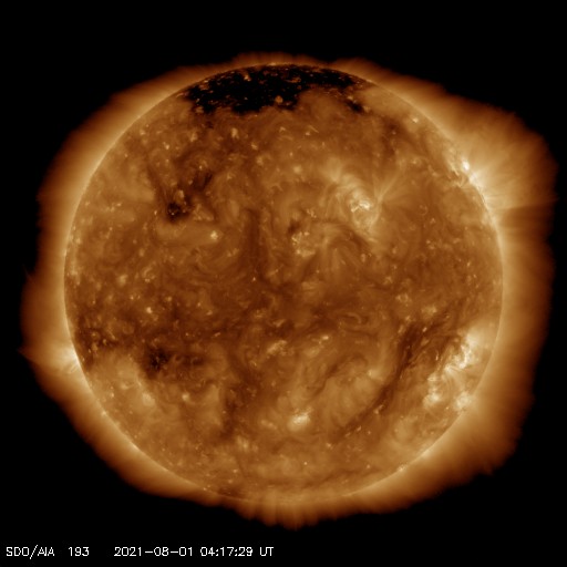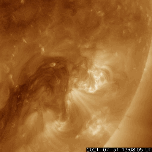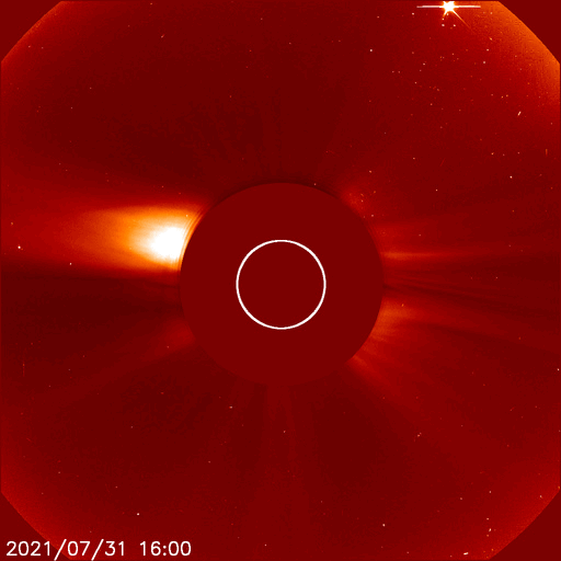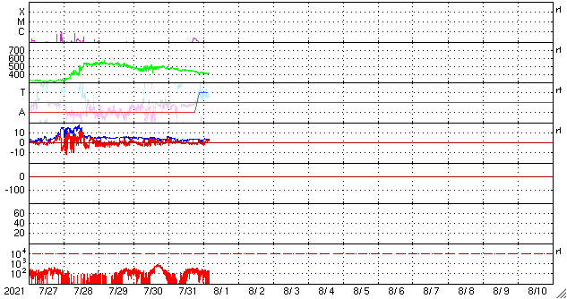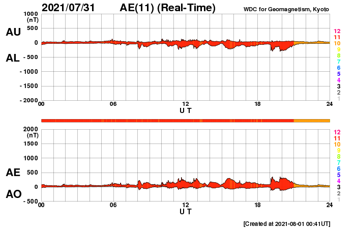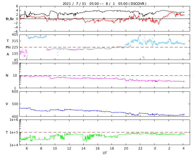 2021/ 8/ 1 13:25 更新 太陽風は平均的な速度に戻っています。太陽でフィラメント噴出が発生しました。 担当 篠原 太陽風の速度は480km/秒から410km/秒へ下がり、 平均的な速度に戻っています。 27日周期の図を見ると、 太陽風速度の高まりは、今回もおよそ3日で終わっています。 太陽風の磁場強度は、2〜4nTとやや弱い状態です。 南北成分の変化は小さくなっていますが、 グラフの中盤が弱い南向きで推移しているためか、 AE指数では、 200nTくらいの小さい変化が次々と発生しています。 その後は変化がなくなり、現在の磁気圏は穏やかです。 SDO衛星AIA193は、中心部はコロナホールはありませんが、 南東の端近く(左下)にはコロナホールがある様です。 今後、次第に見えてくるでしょう。 27日周期の図のの前周期の太陽風を見ると、 7月4日以降、低速の風が続いています。 今回も同様の推移になりそうです。 今日未明、1日1時(世界時7月31日16時)頃、 X線グラフにB2.4の小さい変化が発生しています。 SDO衛星AIA193の動画を掲載します。 太陽の南西側(右下)でフィラメント噴出が発生した様です。 SOHO衛星LASCO C2では、 CME(コロナ質量放出)が観測されています。 太陽の右下に向かってガスが飛び出しています。 規模が小さいことと、地球に対して斜め方向に噴出しているので、 影響はなさそうです。 太陽面では、北西に昨日も見えていた小さい黒点と、 南半球に小さい黒点が発生しています。