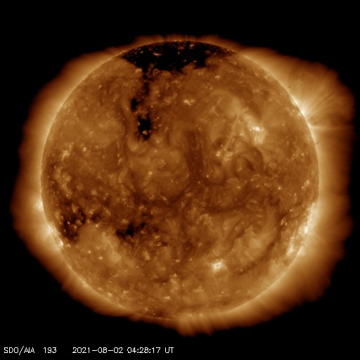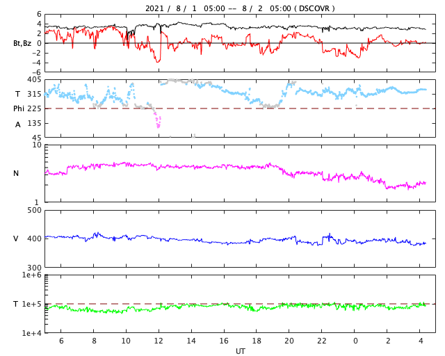 2021/ 8/ 2 13:37 更新 太陽風はやや低速になり、磁気圏も穏やかです。 担当 篠原 太陽風の速度は、昨夜に400km/秒台を割り、 現在は380km/秒とやや低速になっています。 磁場強度も、3nTとやや弱い状態です。 AE指数は小さい変化が見られる程度で、 磁気圏は穏やかです。 SDO衛星AIA193の太陽コロナ写真では、 北東側(左上)に、縦に伸びるコロナホールが、 南東側(左下)に、横に伸びるコロナホールがそれぞれ見えています。 4〜5日後くらいから、 これらの影響が太陽風に現れるかもしれません。 南東のコロナホールについては、 もう2日ほど経つと広がり方が詳しく分かりそうです。 太陽は、南半球の黒点が少し大きくなっていますが、 北半球の黒点はほとんど見えなくなっています。 X線グラフは変化がなく、太陽は穏やかです。 ![]() SDO衛星のAIA193カメラによる太陽コロナの様子 (c) SDO (NASA) ![]() SDO衛星による太陽の可視光写真。マウスの矢印を写真に重ねると、黒点番号付きの写真に切り替わります。 (c) SDO (NASA) ![]() DSCOVRが観測した太陽風の磁場(黒線は全体の強度、赤線は南北成分) 磁場の向き、プラズマの密度、速度、温度 (c) データ:NOAA/SWPC、作図:宇宙天気ニュース ![]() AE指数(速報値) 下段のAEグラフの値が高くなると、オーロラ活動が活発化しています。 (c) 京都大学WDC ![]() ![]() 27日の太陽周期に合わせたデータプロット 太陽が同じ面を地球に向けていた27日前の変化から、今後を予想することができます。 (c) 作図:宇宙天気ニュース