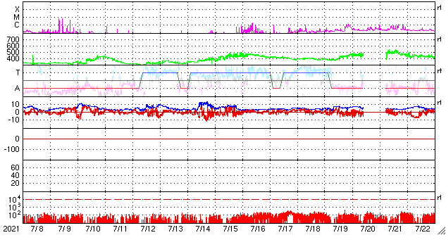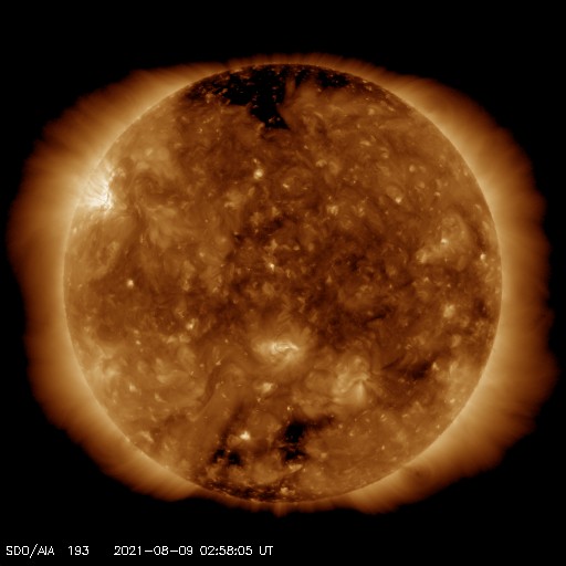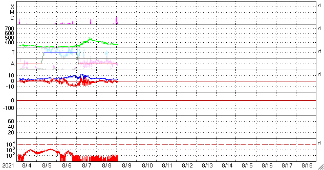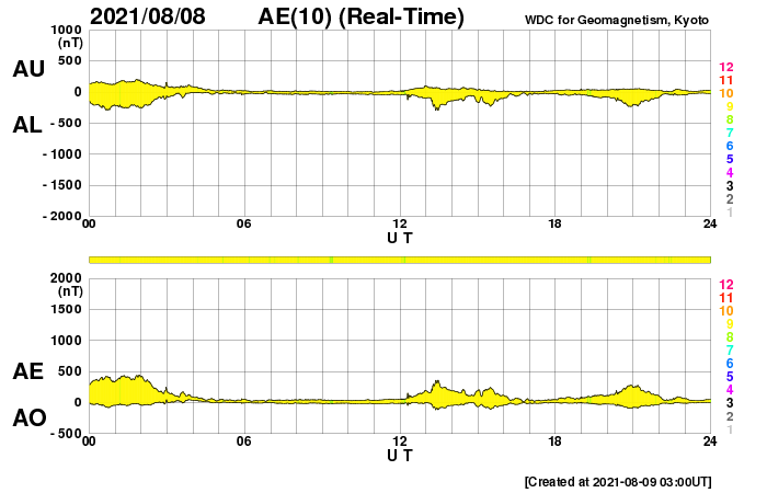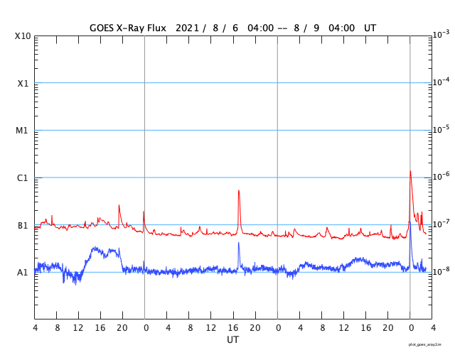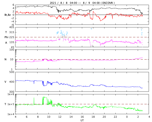 2021/ 8/ 9 12:10 更新 C1の小規模フレアが発生しました。太陽風は低速になっています。 担当 篠原 太陽の北東(左上)の活動的な領域に、 今朝くらいから黒点が見える様になり、 9日9時(世界時9日0時)に、 C1.3の小規模フレアが発生しています。 Cクラスに達するフレアの発生は、 7月24日のC1.5以来で、およそ2週間ぶりです。 この領域の活動度が高まろうとしているのかどうか、 この後の変化に注目してください。 太陽風は、速度が420km/秒から340km/秒へ下がり、 低速になっています。 磁場強度も5nTから4nTに少し下がっています。 グラフの最後で、さらに1nTへ下がっていますが、 これは、太陽風磁場のセクター境界(磁場の大まかな方向の切り替わり) を迎えているためかもしれません。 太陽風の図の2番目のグラフが、 この後、「A」から「T」へ変化するのではないでしょうか 太陽風磁場の南北成分は、 全体としては0nT付近を推移しています。 時々、南向きに少し振れていて、 この影響でAE指数に小規模の変化が発生しています。 太陽風の速度が下がってきたので、 この後も磁気圏は穏やかに推移しそうです。