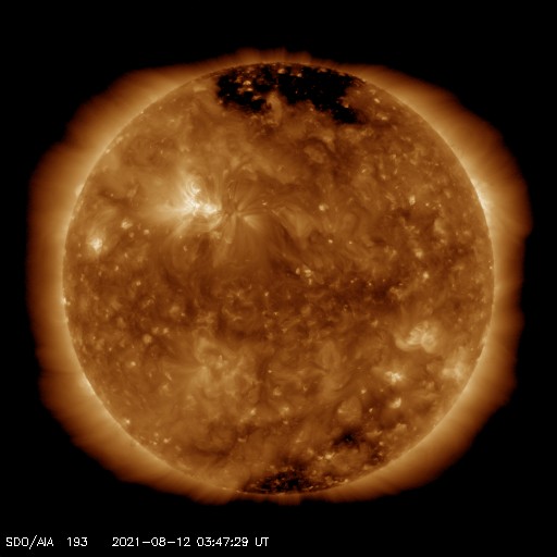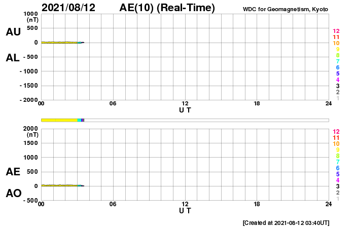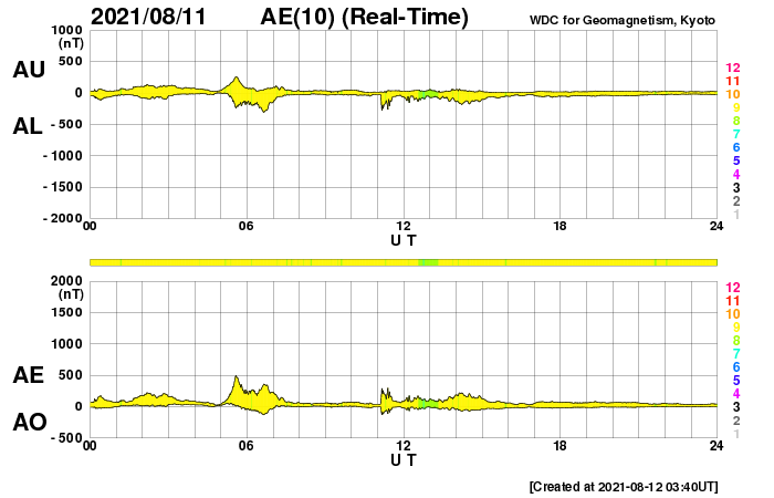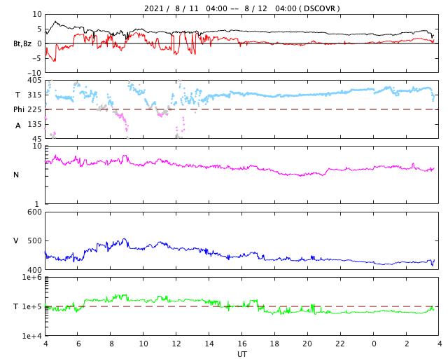 2021/ 8/12 12:55 更新 太陽風は平均的な速度です。磁気圏は穏やかです。 担当 篠原 昨日、450km/秒に少し高まっていた太陽風の速度は、 夕方に500km/秒に達しましたが、以降は低下に向かい、 現在は420km/秒と平均的な速さで安定しています。 磁場強度は、3nTとやや弱くなっています。 磁場の南北成分は、グラフの後半は0nT付近になっています。 このため、磁気圏の活動は穏やかになっていて、 AE指数は、初めの頃に小規模の変化が見られますが、 後半は変化がなくなっています。 27日周期の図を見ると、 前周期の太陽風は、 7月23日頃まで400〜500km/秒で推移しています。 今回はどのような推移になるでしょうか。 太陽は、南西に現れていた黒点に2854群、 東端の黒点に2855群とそれぞれ番号が付けられています。 2854群はかなり小さくなっています。 X線グラフは特に変化はなく、 太陽は穏やかな状態です。 ![]() SDO衛星のAIA193カメラによる太陽コロナの様子 (c) SDO (NASA) ![]() SDO衛星による太陽の可視光写真。マウスの矢印を写真に重ねると、黒点番号付きの写真に切り替わります。 (c) SDO (NASA) ![]() DSCOVRが観測した太陽風の磁場(黒線は全体の強度、赤線は南北成分) 磁場の向き、プラズマの密度、速度、温度 (c) データ:NOAA/SWPC、作図:宇宙天気ニュース ![]() AE指数(速報値) 下段のAEグラフの値が高くなると、オーロラ活動が活発化しています。 (c) 京都大学WDC ![]() ![]() 27日の太陽周期に合わせたデータプロット 太陽が同じ面を地球に向けていた27日前の変化から、今後を予想することができます。 (c) 作図:宇宙天気ニュース