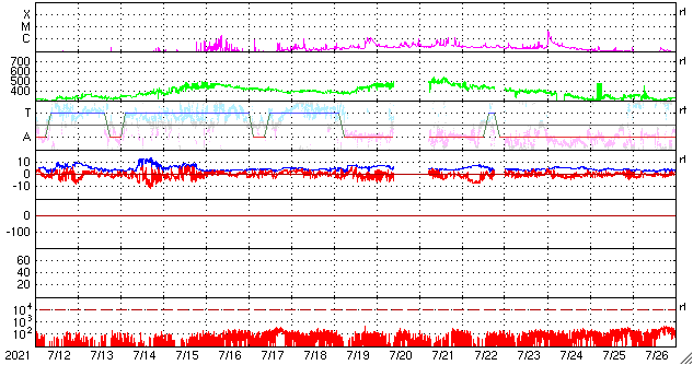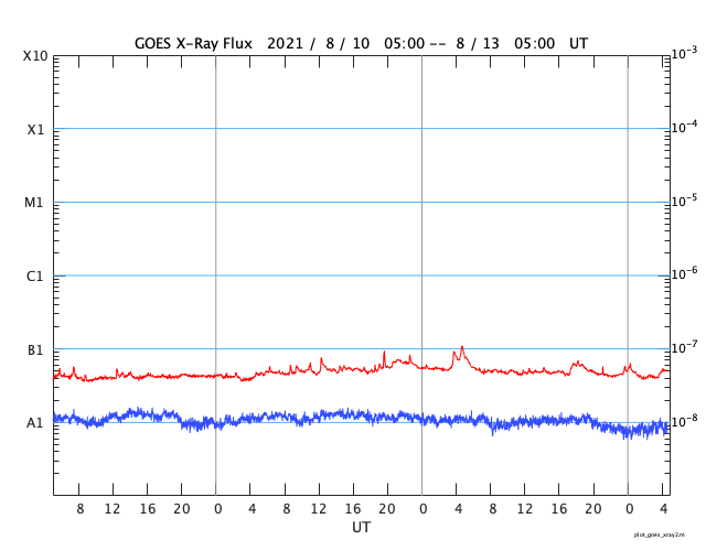 GOES衛星の太陽X線強度。赤・橙 = 0.1〜0.8 nm、青・紫 = 0.05〜0.4 nm (c) データ:NOAA/SWPC、作図:宇宙天気ニュース ![]() | ||||||||||||||||||||||||||||||||||||||||||||||||||||||||||||||||||||||||||||||||||||||||||||||||||||||||||||||||||||||||||||||||||||||||||||||||||||||||||||||||||||||||||||||||||||||||||||||||||||||||||