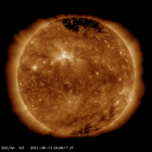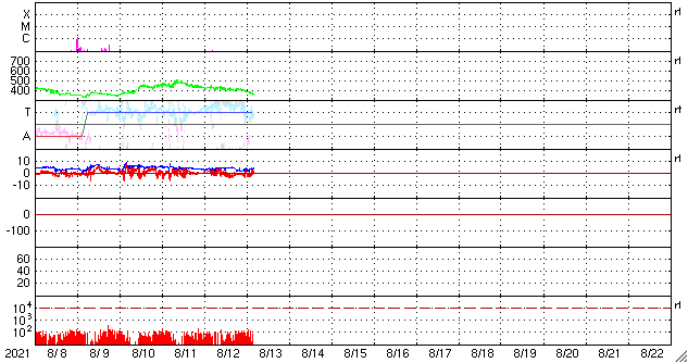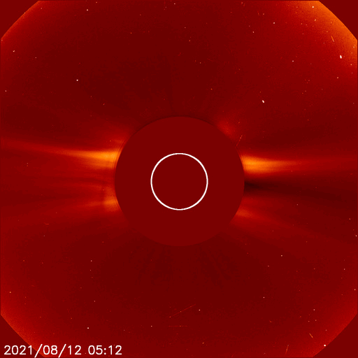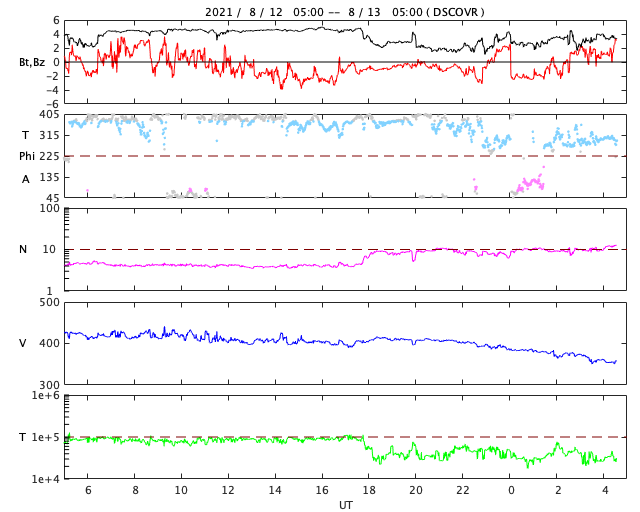2021/ 8/13 13:45 更新 太陽風は350km/秒と低速になっています。 担当 篠原 大雨風の速度は、今朝まで400km/秒を保っていましたが、 その後一段下がって、 現在は350km/秒と低速風になっています。 磁場強度は、3〜4nTとやや弱い状態です。 磁気圏は概ね静穏で、 AE指数は、400nTの小規模の活動と、 小さい変化が見られる程度です。 SDO衛星AIA193は、北極にコロナホールが見えるくらいで、 低緯度域は全体がぼんやりと光っています。 この後も穏やかな太陽風が続きそうです。 太陽は、2854、2855群の黒点が小さく見えています。 X線グラフは特に変化はなく、穏やかです。 しかし、太陽の向こう側では活動が発生している様で、 SOHO衛星LASCO C2では、 CME(コロナ質量放出)が観測されています。 動画では、右、左と2回発生している様です。 ![]() 太陽の向こう側で発生したCME。SOHO衛星LASCO C2。 (c) SOHO (ESA & NASA)、 (動画加工 : 宇宙天気ニュース) ![]() SDO衛星のAIA193カメラによる太陽コロナの様子 (c) SDO (NASA) ![]() SDO衛星による太陽の可視光写真。マウスの矢印を写真に重ねると、黒点番号付きの写真に切り替わります。 (c) SDO (NASA) ![]() DSCOVRが観測した太陽風の磁場(黒線は全体の強度、赤線は南北成分) 磁場の向き、プラズマの密度、速度、温度 (c) データ:NOAA/SWPC、作図:宇宙天気ニュース ![]() AE指数(速報値) 下段のAEグラフの値が高くなると、オーロラ活動が活発化しています。 (c) 京都大学WDC ![]() ![]() 27日の太陽周期に合わせたデータプロット 太陽が同じ面を地球に向けていた27日前の変化から、今後を予想することができます。 (c) 作図:宇宙天気ニュース