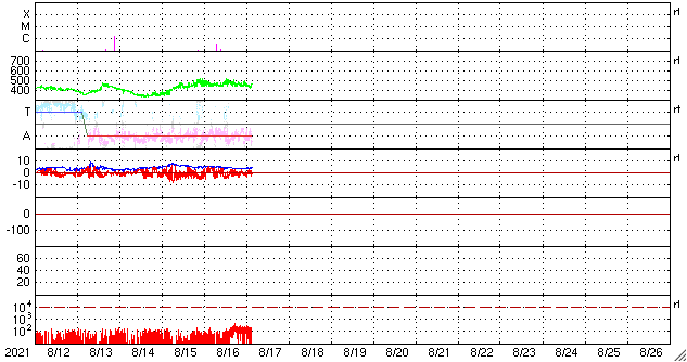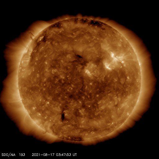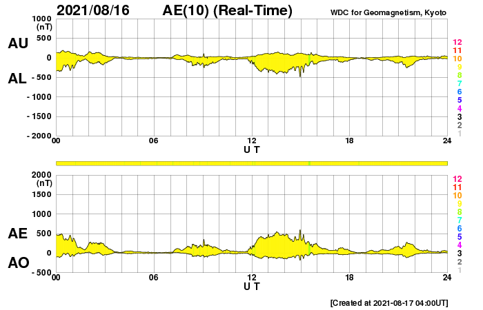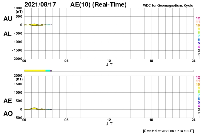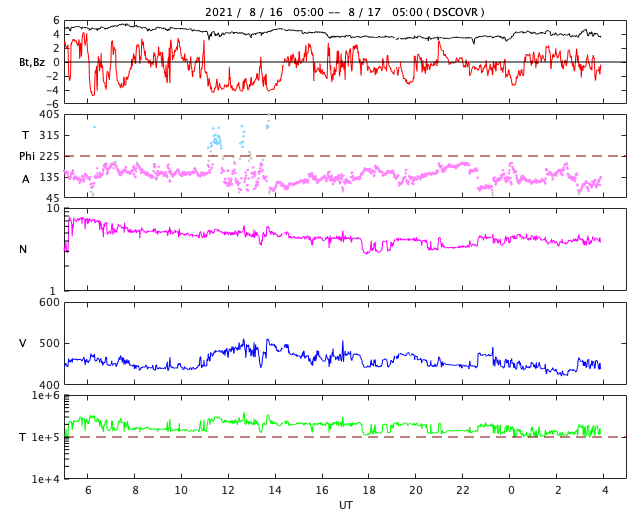 2021/ 8/17 13:05 更新 太陽風は450km/秒付近で推移しています。 担当 篠原 太陽風の速度は、450km/秒前後で推移しています。 磁場強度は、5nTから4nTへ少し下がっています。 太陽風は平均的な状態が続いています。 磁場の南北成分は、 弱い南向きの変化が度々発生しています。 AE指数のグラフは、 200〜500nTの変化が数時間おきに発生していて、 やや活動的な様子です。 SDO衛星AIA193では、 太陽の低緯度域は、 小さいコロナホールがぽつぽつと見える程度です。 27日周期の図の前周期の太陽風は、 400km/秒台の速度がもう3日ほど続いています。 今回もそのくらいまで続くのでしょうか。 太陽は、北西(右上)に2857黒点群があるだけです。 ここでBクラスの小さいフレアが2回発生しています。 太陽は穏やかな状態が続いています。 ![]() SDO衛星のAIA193カメラによる太陽コロナの様子 (c) SDO (NASA) ![]() SDO衛星による太陽の可視光写真。マウスの矢印を写真に重ねると、黒点番号付きの写真に切り替わります。 (c) SDO (NASA) ![]() DSCOVRが観測した太陽風の磁場(黒線は全体の強度、赤線は南北成分) 磁場の向き、プラズマの密度、速度、温度 (c) データ:NOAA/SWPC、作図:宇宙天気ニュース ![]() AE指数(速報値) 下段のAEグラフの値が高くなると、オーロラ活動が活発化しています。 (c) 京都大学WDC ![]() ![]() 27日の太陽周期に合わせたデータプロット 太陽が同じ面を地球に向けていた27日前の変化から、今後を予想することができます。 (c) 作図:宇宙天気ニュース