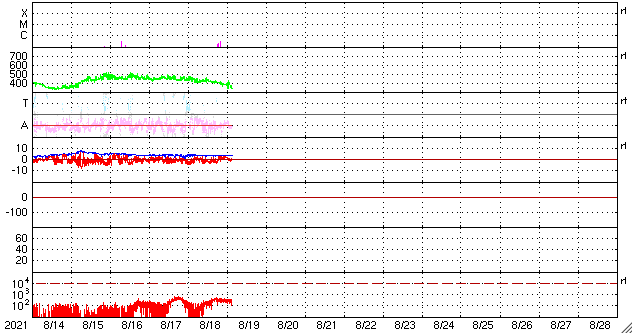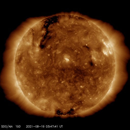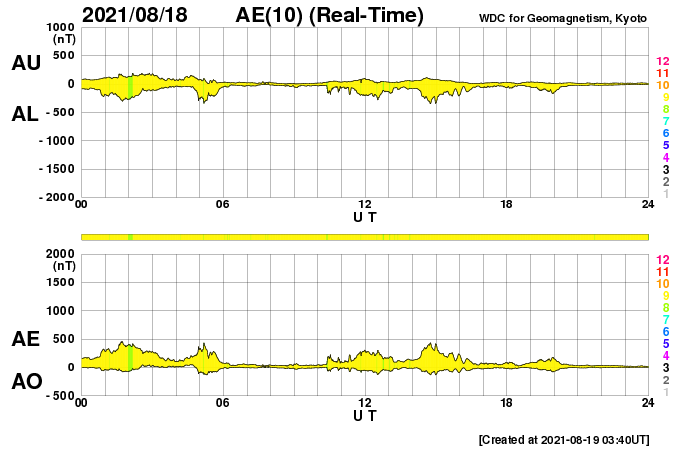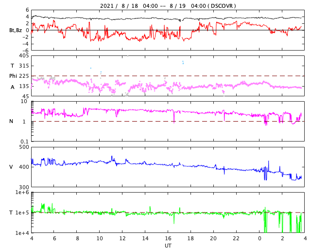 2021/ 8/19 12:57 更新 太陽風は低速になっています。新しい黒点が現れています。 担当 篠原 今朝早くに太陽風の速度は400km/秒台を割り、 現在は350km/秒と低速の風になっています。 27日周期の図の前周期と同様に、 速度の弱い高まりは終わりを迎えた様です。 磁場強度は、4nTと平均的な状態です。 南北成分は、グラフの中盤までは南寄りですが、 後半は北寄りになっています。 これに対応して、AE指数のグラフも、 途中までは小規模の変化が起きていますが、 後半は変化がなくなっています。 太陽風の速度が下がってきたので、 この後の磁気圏は、基本的には穏やかに推移するでしょう。 SDO衛星AIA193では、 北東側(左上)にコロナホールが縦に伸びています。 次の注目は、この領域の影響になりそうです。 5日後くらいになるかもしれません。 太陽では、中心部に新しい黒点が現れ、 2858群と番号が付けられています。 B1〜2の小さいフレアを3回起こしています。 また、西の端(右端)近くの2857群の少し右側にも、 新しい黒点が現れています。