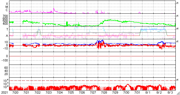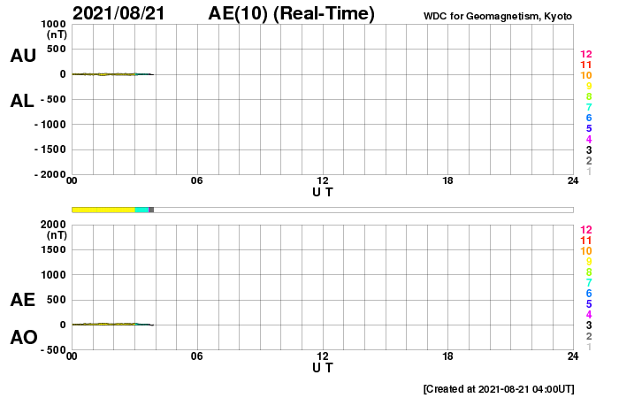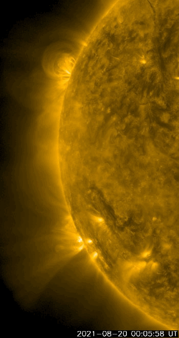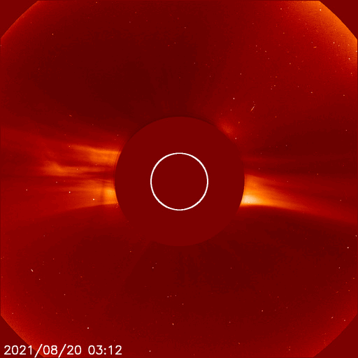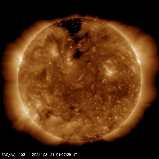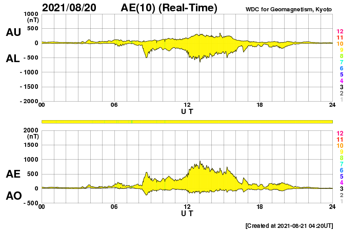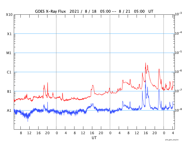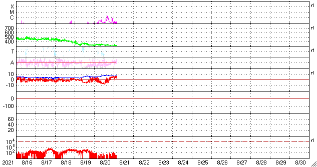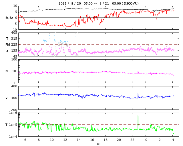 2021/ 8/21 13:23 更新 太陽の東端から黒点が現れています。太陽風は低速です。 担当 篠原 太陽の北東の端(左上)から新しい黒点が姿を現しました。 昨日からBクラスの小さいフレアを起こしていた領域で、 今日に入ると、 21日1時から1時半(世界時20日16時から16時半)にC3.0とC2.3、 今朝、21日6時半(世界時20日21時半)にはC1.4と、 小規模フレアを3回発生させています。 活動の様子を、SDO衛星AIA171の動画で紹介します。 この動画では、太陽の北東(左上)だけでなく、 南東(左下)でも活動が発生しています。 STEREO Ahead衛星によると、 こちら側にも活動的な領域があり、 この後、SDO衛星でも見えるようになるでしょう。 この南東の領域で、 20日15時(世界時20日6時)頃にフレアが発生した様で、 SDO衛星AIA171では、コロナのガスが飛び出し、 その後にポストフレアループが輝いています。 そして、SOHO衛星LASCO C2、C3では、 CME(コロナ質量放出)も撮影されています。 地球に対して横向きに飛び出しているので、影響はありません。 北東側(左上)では、見えてきた領域の向こう側にも 別の活動領域がある様です。 この後、太陽の活動が高まって行くでしょうか。 太陽風は、310km/秒と低速の風が続いています。 磁場は、昨日のニュースの後に 5nTから7nTへゆっくりと強まり、 それと共に磁場の南北成分が南向きに強まる変化が 半日近く続きました。 このため、AE指数は最大で800nTに達する 中規模の変化が発生しています。 現在の磁場は北向きに振れていて、 磁気圏は穏やかになっています。 SDO衛星AIA193では、 北半球のコロナホールが太陽の中心線に達しています。 3日後くらいから 太陽風速度の高まりが見られるかもしれません。