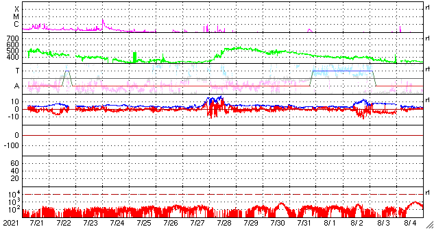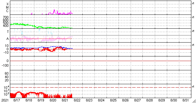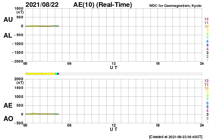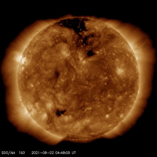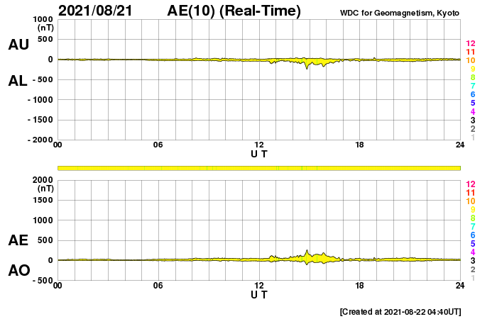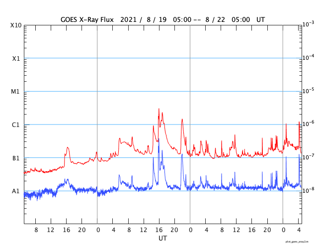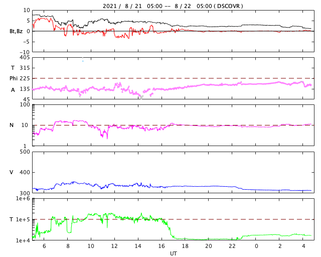 2021/ 8/22 13:57 更新 小規模フレアが2回発生しています。低速の太陽風が続いています。 担当 篠原 太陽の北東の黒点には、 2859群と番号が付けられています。 昨日のニュース以降もBクラスの小さい活動が続き、 22日10時(世界時22日1時)にC1.0、 22日13時(世界時22日4時)にC1.2と、 Cクラスの小規模フレアが2回発生しています。 引き続き注目してください。 太陽風は、昨日の午後に速度が350km/秒へ少し上がりましたが、 その後再び低下して、現在は310km/秒に戻っています。 磁場強度は、7nTからゆっくりと下がり、 現在は1〜2nTまで弱くなっています。 磁気圏は静穏で、 AE指数は小さい変化が一時的に発生した程度です。 SDO衛星AIA193では、 北極から縦に伸びるコロナホールが西半球側に進んでいます。 明後日くらいからこの領域の影響が始まるかもしれません。 前周期は530km/秒くらいの高速風がやって来ましたが、 今回はどうなるでしょうか。 ![]() SDO衛星のAIA193カメラによる太陽コロナの様子 (c) SDO (NASA) ![]() SDO衛星による太陽の可視光写真。マウスの矢印を写真に重ねると、黒点番号付きの写真に切り替わります。 (c) SDO (NASA) ![]() GOES衛星の太陽X線強度。赤・橙 = 0.1〜0.8 nm、青・紫 = 0.05〜0.4 nm (c) データ:NOAA/SWPC、作図:宇宙天気ニュース ![]() DSCOVRが観測した太陽風の磁場(黒線は全体の強度、赤線は南北成分) 磁場の向き、プラズマの密度、速度、温度 (c) データ:NOAA/SWPC、作図:宇宙天気ニュース ![]() AE指数(速報値) 下段のAEグラフの値が高くなると、オーロラ活動が活発化しています。 (c) 京都大学WDC ![]() ![]() 27日の太陽周期に合わせたデータプロット 太陽が同じ面を地球に向けていた27日前の変化から、今後を予想することができます。 (c) 作図:宇宙天気ニュース