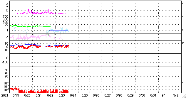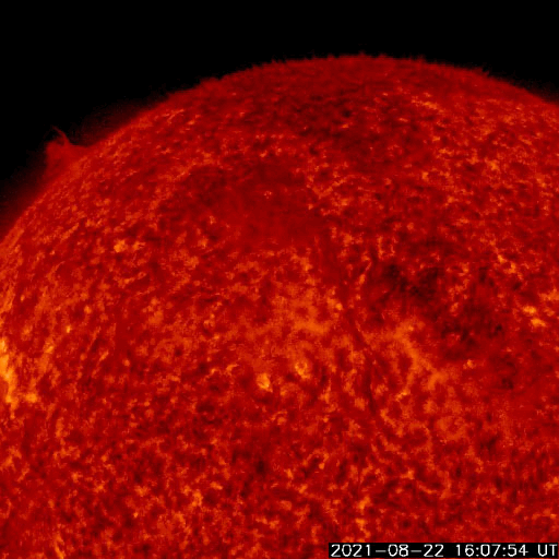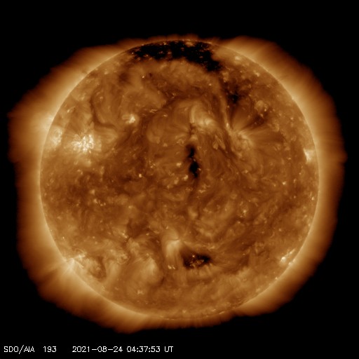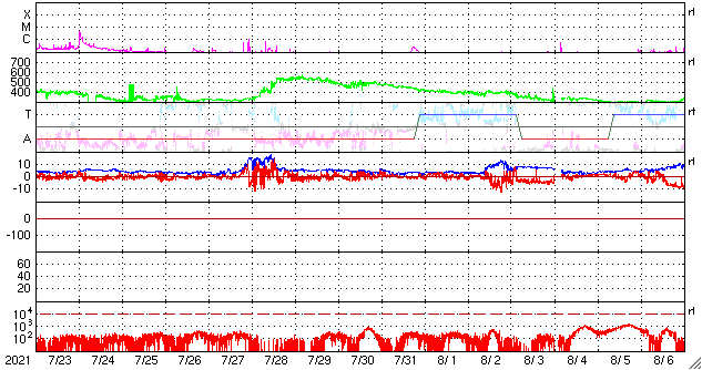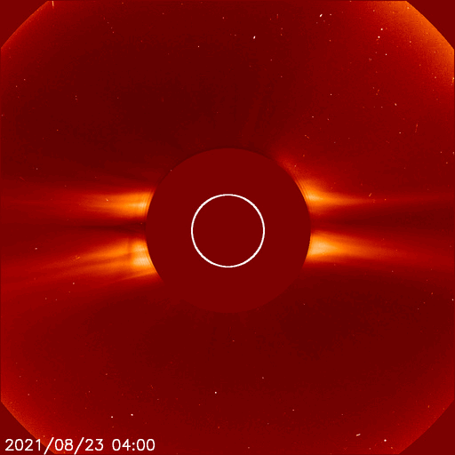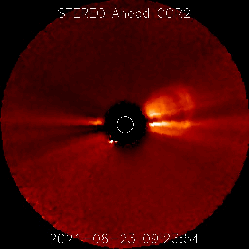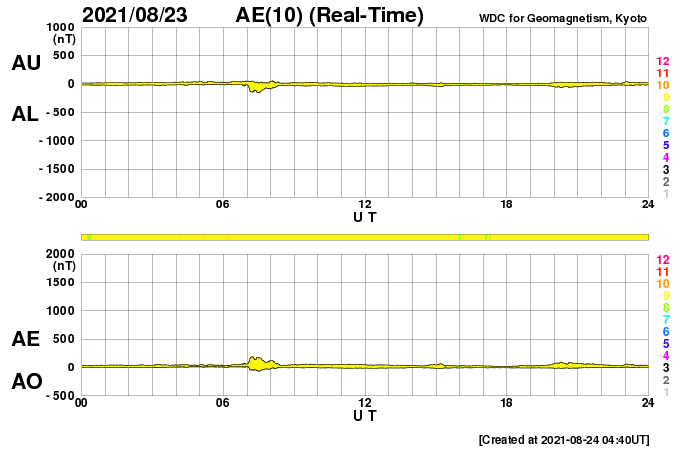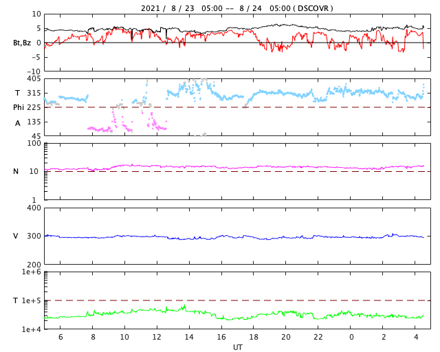 2021/ 8/24 13:49 更新 フィラメント噴出によりCMEが発生しています。太陽風は低速です。 担当 篠原 昨日の朝に太陽の北半球側でフィラメント噴出が発生しました。 SDO衛星AIA304による動画を掲載します。 写真の中心部のもやっとしたガスが、 揺らぎながら見えなくなって行く様子が分かります。 この噴出によりCME(コロナ質量放出)が発生しています。 2枚目はSOHO衛星LASCO C2、C3による動画です。 噴出するガスが淡いため、とても見にくくなっていますが、 太陽全体を囲むようにガスが広がっています。 太陽を左斜めから観測しているSTEREO Ahead衛星では、 CMEが地球のある右側に向かって噴出する様子を 見ることができます。 3枚目はCOR2の動画です。 現時点では最初の頃の写真が欠けているため、 既にガスが飛び出した状態からの動画になっています。 太陽の中心付近で発生しているので、 磁場の乱れなどの太陽風の変化が 27〜28日頃に到来する可能性があります。 その場合、オーロラの活動が強まるなどの 変化が発生するかもしれません。 現在の太陽風は、 速度は300km/秒と低速の状態が続いています。 磁場強度は、5nTと平均的な状態です。 磁気圏は穏やかで、 AE指数は小さい変化が見られる程度です。 27日周期の図を見ると、 前周期の太陽風(7月28日)は、 磁場が強まって、速度が上昇を始めた頃です。 今回はこの後どの様に推移するでしょうか。 太陽は、南東(左下)と南西(右下)に、 小さい黒点が発生している様です。 X線グラフは特に変化はなく、穏やかです。