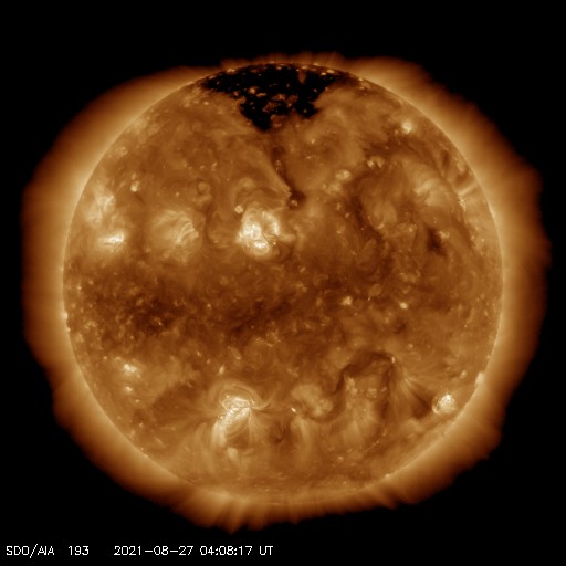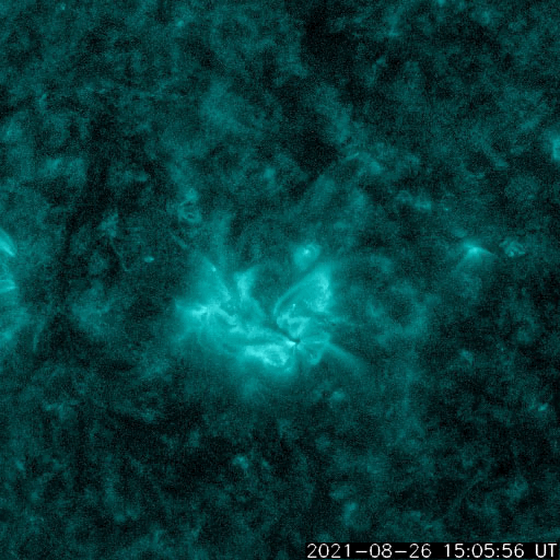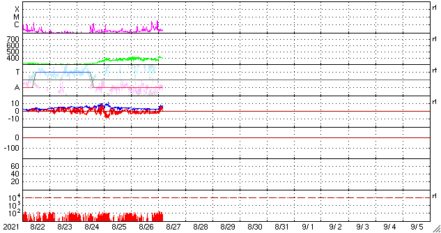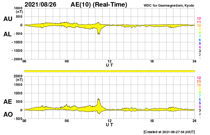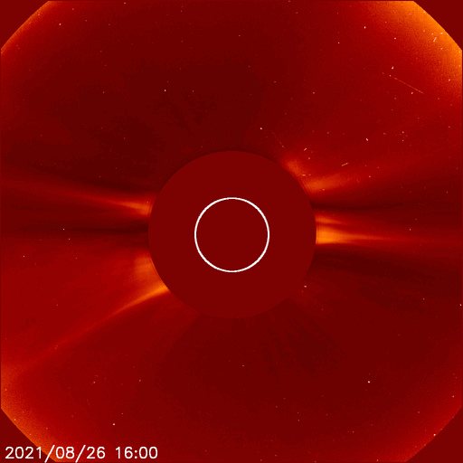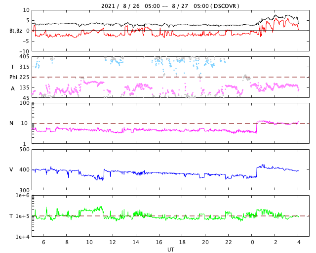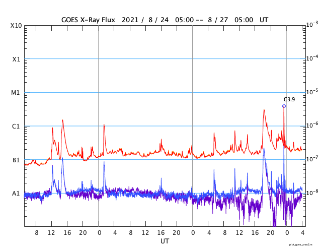 2021/ 8/27 13:19 更新 小規模フレアが発生し、CMEも噴出しています。太陽風の小さい乱れが到来しています。 担当 篠原 太陽の中心部の北側の2859黒点群で、 今日未明、27日3時(世界時26日18時)に C3.0の小規模フレアが発生しました。 SDO衛星AIA131、193による動画を掲載します。 茶色の写真のAIA193では、 フレアの場所から周囲に向かって コロナのガスが広がっていく様子も見えています。 SOHO衛星LASCO C2、C3では、 CME(コロナ質量放出)が観測されています。 太陽の左側を中心に、太陽を包む様にガスが広がっています。 発生地点が太陽の中心に近いので、 CMEは地球の方向にも飛び出していると考えられます。 発生から4日後くらいと考えると、 31日か9月1日頃に太陽風の乱れがやって来る可能性があります。 太陽では、南半球の2860黒点群でも、 C1.3、C3.9と小規模フレアが2回発生しています。 2860群は昨日よりも黒点が大きくなっています。 3枚目にSDO衛星による拡大写真を掲載します。 また、北東(左上)に現れていた黒点に、 2861群と番号が付けられています。 太陽風は、今朝、27日9時半(世界時27日0時半)に、 小幅ですが速度や密度の急な増加が発生しています。 速度は、360km/秒と低速になっていましたが、 410km/秒へ高まって平均的な速さに戻っています。 磁場強度も3nTから7nTへ少し強まっていますが、 こちらの変化はなだらかでした。 24日のニュースで紹介した、 23日のCMEによる乱れが到来した様です。 発生から到来まで3日半ほどかかっています。 太陽風磁場の南北成分は、北向きに強まっています。 このため磁気圏への影響は小さく、 AE指数のグラフの最後は、変化がほとんどありません。 明日は、24日のCMEの乱れが到来するかもしれません。 その後も今朝のCMEの到来と、しばらく変化が続きそうです。 ![]() 2859黒点群で発生したC3.0の小規模フレア。SDO衛星AIA131、193。 (c) SDO (NASA)、(動画加工 : 宇宙天気ニュース) ![]() C3.0のフレアに伴って発生したCME。SOHO衛星LASCO C2、C3。 (c) SOHO (ESA & NASA)、 (動画加工 : 宇宙天気ニュース) ![]() さらに大きくなった2860黒点群。SDO衛星。 (c) SDO (NASA)、作図:宇宙天気ニュース ![]() SDO衛星のAIA193カメラによる太陽コロナの様子 (c) SDO (NASA) ![]() SDO衛星による太陽の可視光写真。マウスの矢印を写真に重ねると、黒点番号付きの写真に切り替わります。 (c) SDO (NASA) ![]() GOES衛星の太陽X線強度。赤・橙 = 0.1〜0.8 nm、青・紫 = 0.05〜0.4 nm (c) データ:NOAA/SWPC、作図:宇宙天気ニュース ![]() DSCOVRが観測した太陽風の磁場(黒線は全体の強度、赤線は南北成分) 磁場の向き、プラズマの密度、速度、温度 (c) データ:NOAA/SWPC、作図:宇宙天気ニュース ![]() AE指数(速報値) 下段のAEグラフの値が高くなると、オーロラ活動が活発化しています。 (c) 京都大学WDC ![]() ![]() 27日の太陽周期に合わせたデータプロット 太陽が同じ面を地球に向けていた27日前の変化から、今後を予想することができます。 (c) 作図:宇宙天気ニュース