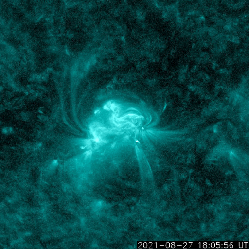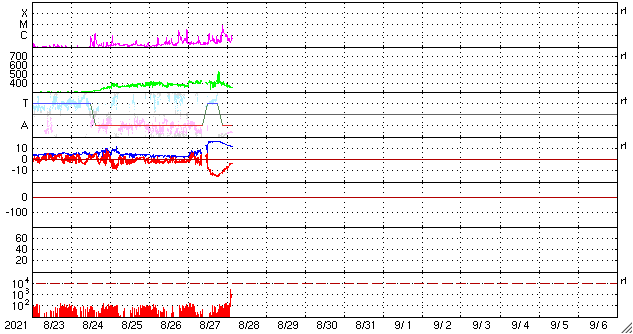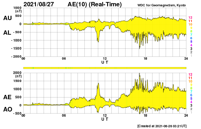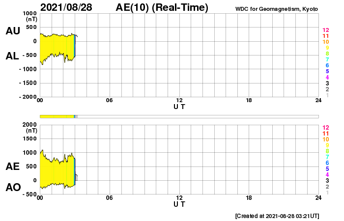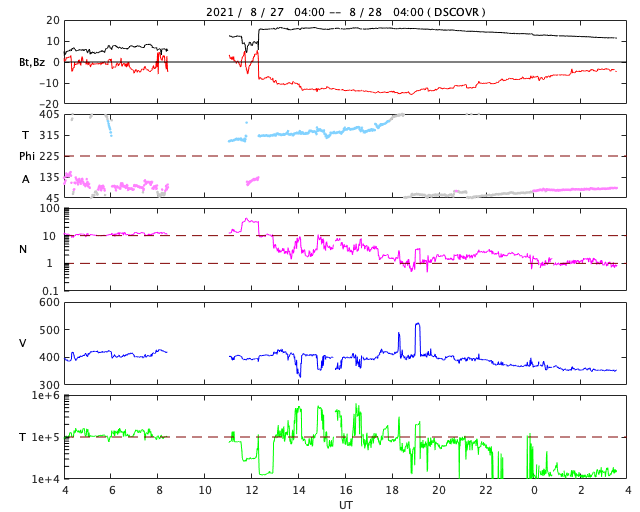 2021/ 8/28 12:42 更新 C7.3の小規模フレアが発生しました。太陽風磁場が南向きに強まり、磁気圏の活動も強まっています。 担当 篠原 今朝早く、28日5時半(世界時27日20時半)に、 太陽の南半球の2860黒点群で、 C7.3と少し大きめの小規模フレアが発生しました。 SDO衛星AIA131による動画を掲載します。 C7に達する規模のフレアの発生は、 7月9日に発生したC7.0以来、1か月半ぶりです。 発生地点の2860群は、更に黒点が大きくなっています。 SDO衛星による拡大写真を掲載します。 太陽では、南西の端近く(右下)に2862黒点群が発生していて、 (昨日のニュースの時点で、黒点は既に現れていました) ここでもC1.1の小規模フレアが発生しています。 引き続き、太陽の活動に注目してください。 昨日の朝に太陽風の乱れが到来していましたが、 夜に入ると磁場強度が更に強まり、16nTに達しました。 それと共に磁場の南北成分は 南向きに大きく振れるようになり、 最大で -15nTくらいの変化に達しました。 速度は400km/秒と平均的な状態でしたが、 磁気圏の活動は一気に強まり、 AE指数は、1500nTから瞬間的に2000nTに達する 激しい変化が発生しています。 また、磁気嵐も発生していて、 京都大学WDCのDst指数速報値は -74nTに達しています。 (Dst指数はマイナス方向に強まります) 現在の太陽風は、 磁場強度は12nTと強まった状態ですが、 南北成分は-3nTと、南向きの変化は小さくなっています。 速度は350km/秒へ下がり、低速になっています。 AE指数はまだ500〜1000nTと中規模の変化が続いていますが、 この後、変化は小さくなりそうです。 一方、この後も次のCMEによる乱れが到来する可能性があります。 太陽風の推移にも注目して下さい。 太陽風の乱れの影響で、 放射線帯の高エネルギー電子が少し増加しています。 この後、さらに高まる可能性があります。 ![]() C7.3フレアの様子。SDO衛星AIA131。 (c) SDO (NASA)、(動画加工 : 宇宙天気ニュース) ![]() SDO衛星による2860黒点群。 (c) SDO (NASA)、作図:宇宙天気ニュース ![]() Dst指数の速報値は、-74nTまで下がっています。 (c) 京都大学WDC ![]() SDO衛星のAIA193カメラによる太陽コロナの様子 (c) SDO (NASA) ![]() SDO衛星による太陽の可視光写真。マウスの矢印を写真に重ねると、黒点番号付きの写真に切り替わります。 (c) SDO (NASA) ![]() GOES衛星の太陽X線強度。赤・橙 = 0.1〜0.8 nm、青・紫 = 0.05〜0.4 nm (c) データ:NOAA/SWPC、作図:宇宙天気ニュース ![]() DSCOVRが観測した太陽風の磁場(黒線は全体の強度、赤線は南北成分) 磁場の向き、プラズマの密度、速度、温度 (c) データ:NOAA/SWPC、作図:宇宙天気ニュース ![]() AE指数(速報値) 下段のAEグラフの値が高くなると、オーロラ活動が活発化しています。 (c) 京都大学WDC ![]() ![]() 27日の太陽周期に合わせたデータプロット 太陽が同じ面を地球に向けていた27日前の変化から、今後を予想することができます。 (c) 作図:宇宙天気ニュース