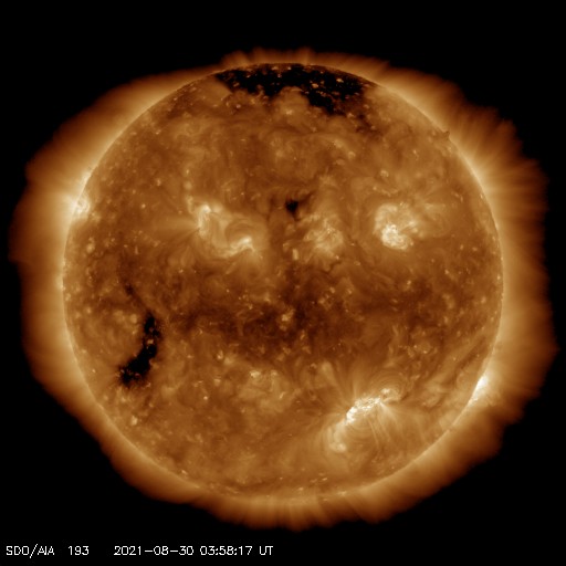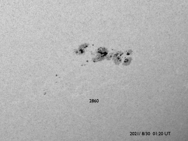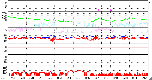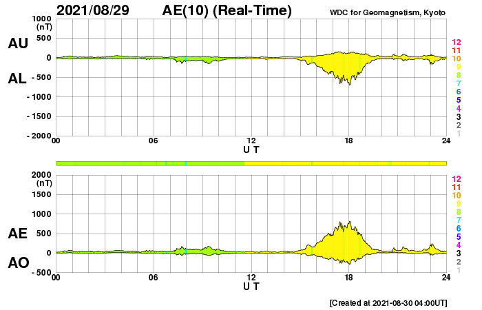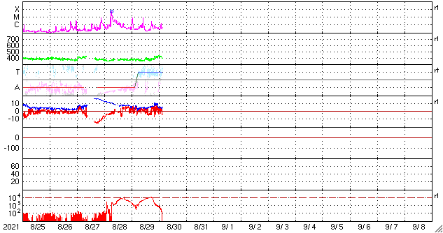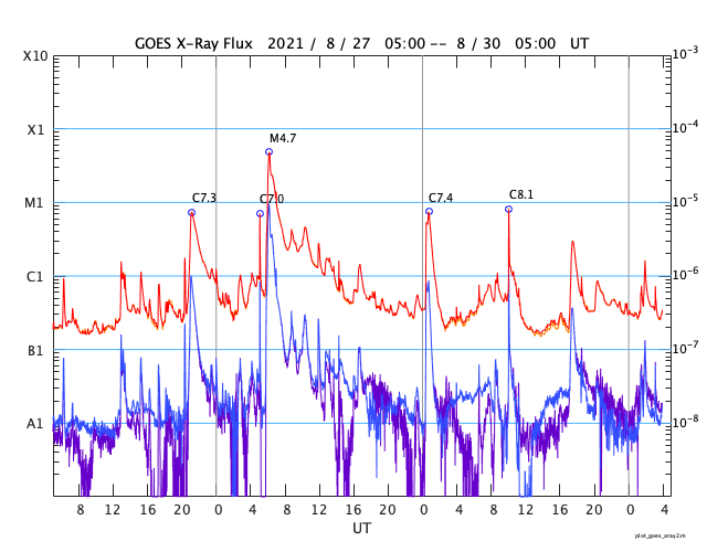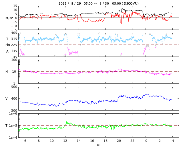2021/ 8/30 13:09 更新 2860黒点群で小規模フレアが続いています。太陽風は平均的な状態です。 担当 篠原 2860黒点群ではフレアの発生が続いています。 昨夜、29日19時(世界時29日10時)には、 C8.1の小規模フレアが発生し、 その後も、C2.9、C1.6などが続いています。 活動の規模は次第に小さくなっている様ですが、 引き続き注目して下さい。 太陽風は、速度が370km/秒から400km/秒へ少し上がり、 平均的な速さになっています。 磁場強度は、上がったり下がったりしていますが、 概ね5nT前後で推移している様です。 太陽風のグラフを細かく見ると、 今朝、30日5時(世界時29日20時)頃に、 磁場強度、密度、速度が 一斉に小さく上昇する変化が発生しています。 CMEの影響がやって来たのでしょうか。 AE指数は、太陽風磁場が南向きに変化した頃に 800nTの中規模の変化が発生していますが、 その他は静かです。 SDO衛星AIA193の太陽コロナ写真では、 太陽の南東(左下)にコロナホールが見えています。 この領域は、27日周期の図の前周期の8月7日に 太陽風速度の高まりをもたらしています。 今回は、9月3日頃になるのでしょうか。 放射線帯の高エネルギー電子は、 1万に高まった状態が続いています。 磁気圏活動の影響で、明日は減少しているかもしれません。