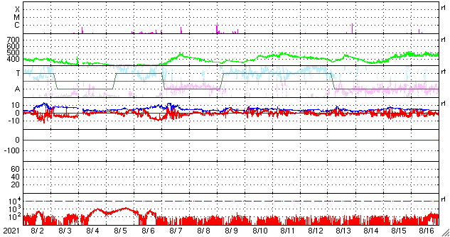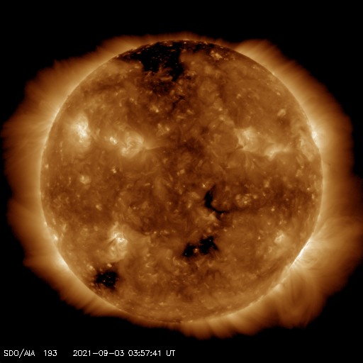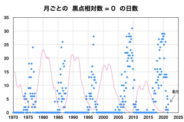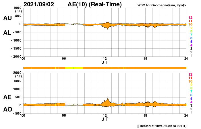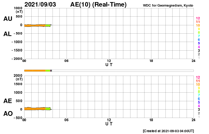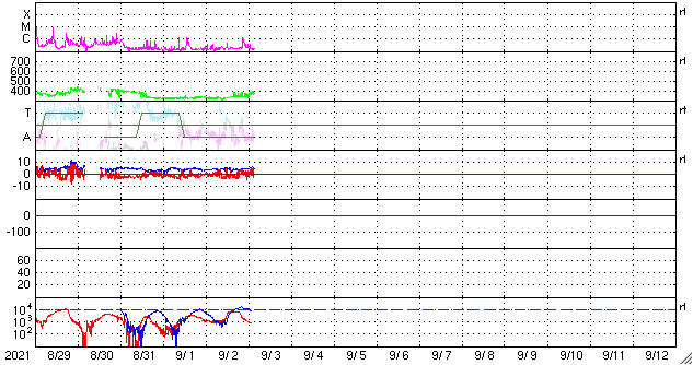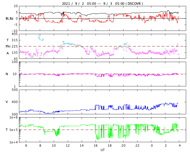2021/ 9/ 3 13:08 更新 太陽風はやや低速で、磁気圏は穏やかです。8月の黒点相対数は 22.4 でした。 担当 篠原 WDC-SILSOより、 8月の黒点相対数は、22.4 と発表されました。 7月の34.4からは下がっていますが、 4〜6月が20台でしたので、 同程度で推移していると考えられます。 1枚目の図で、11年前の2010頃の値と比較すると、 同じくらいの水準が続いています。 現在の第25期は、 ここまでは第24期と同等の変化になっていると言えそうです。 太陽風は、速度のグラフが乱れていますが、 次第に速度が上がって、380km/秒くらいになっている様です。 やや低速くらいの状態です。 磁場強度は、4〜5nTと平均的な状態が続いています。 磁気圏は穏やかで、 AE指数は小さい変化が見られる程度です。 SDO衛星AIA193では、 南半球のコロナホールが西半球側に進んでいます。 明後日くらいから影響が始まりそうです。 太陽は、南東(左下)の黒点に2863群と番号が付けられています。 南西(右下)の2860群は、もうすぐ沈みそうです。 この2860群でC1.2の小規模フレアが発生していますが、 目立った変化はこのくらいで、 太陽は穏やかに推移しています。