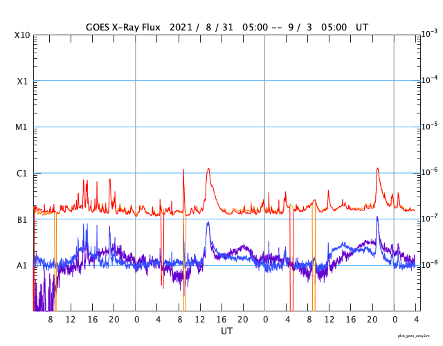 GOES衛星の太陽X線強度。赤・橙 = 0.1〜0.8 nm、青・紫 = 0.05〜0.4 nm (c) データ:NOAA/SWPC、作図:宇宙天気ニュース ![]() | |||||||||||||||||||||||||||||||||||||||||||||||||||||||||||||||||||||||||||||||||||||||||||||||||||||||||||||||||||||||||||||||||||||||||||||||||||||||||||||||||||||||||||||||||||||||||||||||||||||||||||||||||||