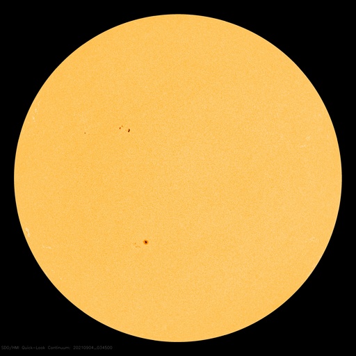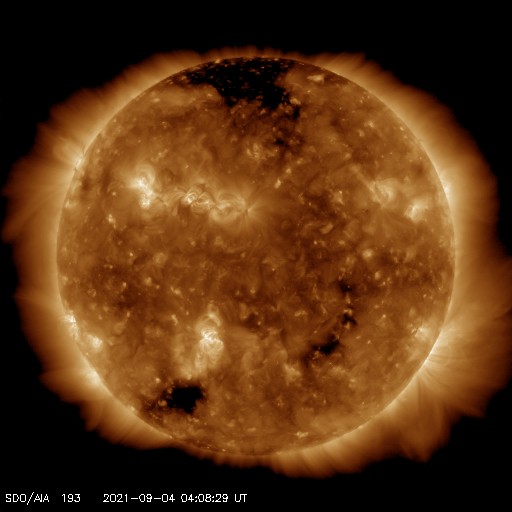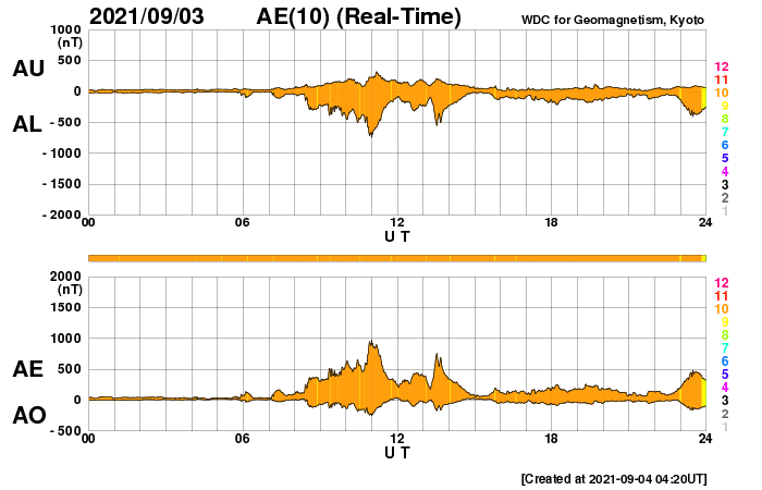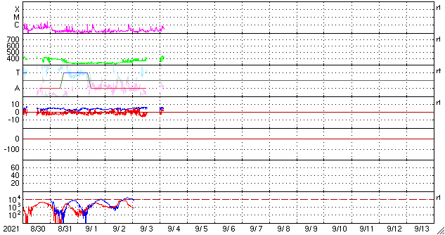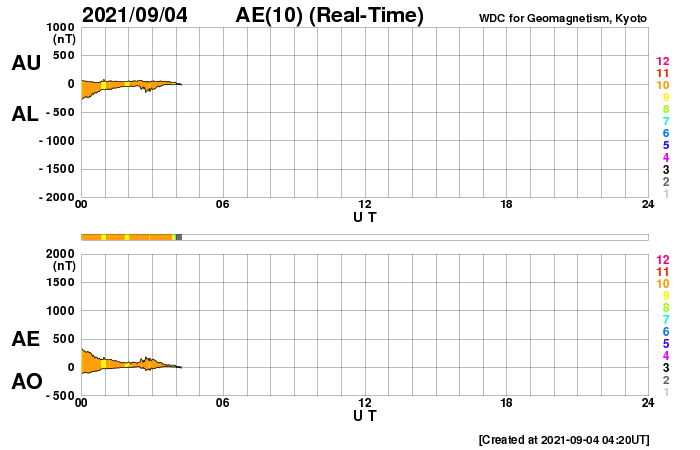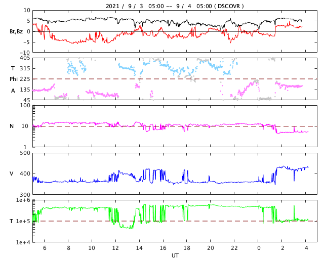 2021/ 9/ 4 13:20 更新 太陽風は平均的な速度のなっています。太陽のあちこちに黒点が現れています。 担当 篠原 太陽風の速度は、360km/秒と低速の状態から、 図の最後で420km/秒と平均的な速さに上がっています。 グラフの後半で急に上がった様になっていますが、 速度の途中のデータは不安定になっている印象で、 正しい変化ではないかもしれません。 磁場強度は、5nT前後と平均的な状態です。 南北成分は、南寄りの傾向から、 後半は0nT付近で変化する様になっています。 オーロラの活動度を示すAE指数のグラフも、 初めの頃に500nTを越える中規模の変化が発生してますが、 後半は変化が小さくなっています。 SDO衛星AIA193では、 南半球のコロナホールは更に西に進み、 斜めになった分、やや見にくくなっています。 この領域の影響が、明日くらいから始まりそうです。 太陽は、あちこちに新しい黒点が現れて、 にぎやかになっています。 フレアは、Bクラスの変化が起きているだけですが、 この後、活動が強まるなどするでしょうか。