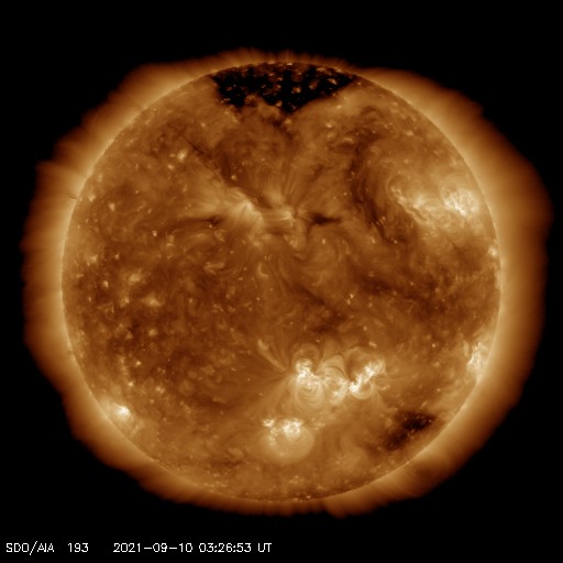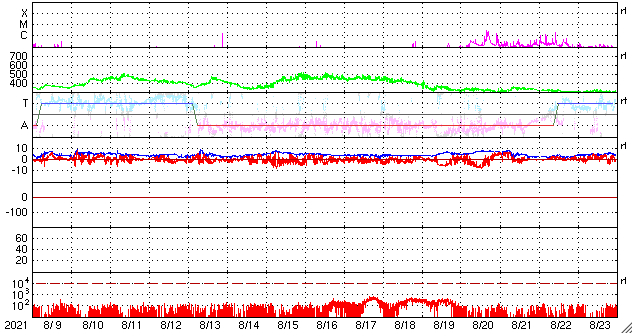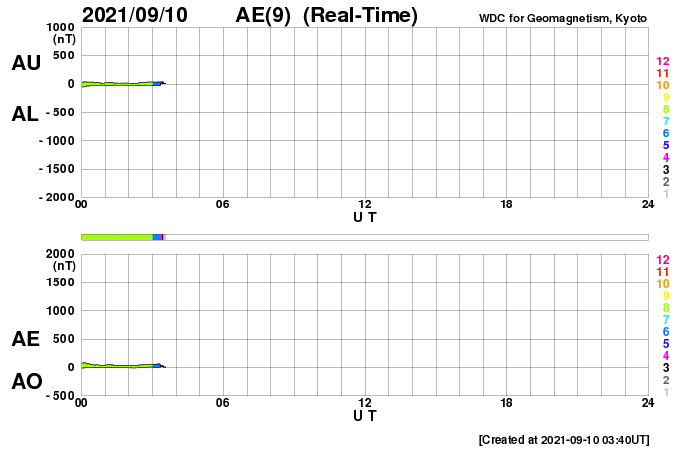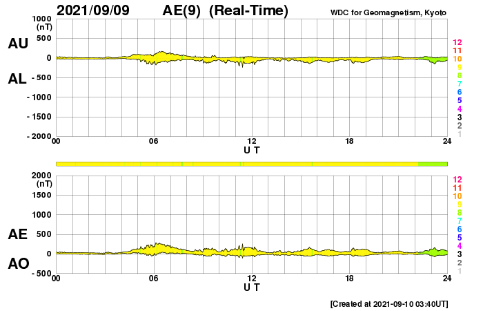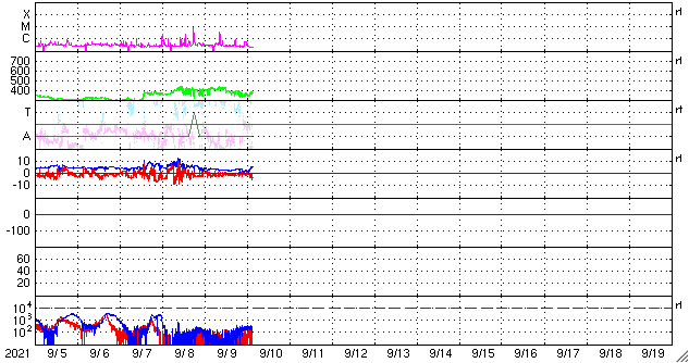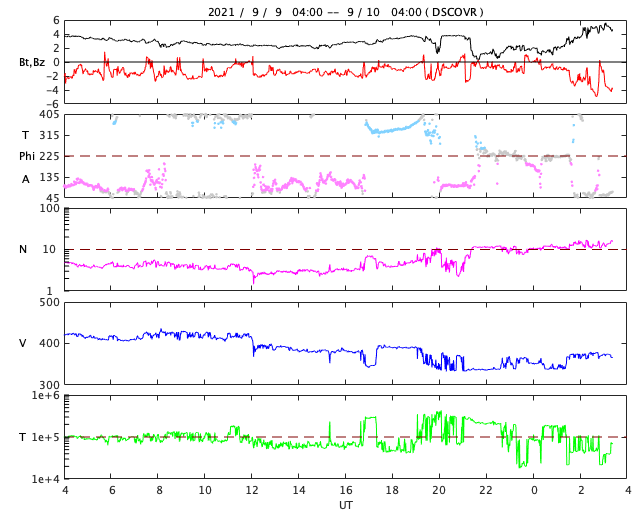 2021/ 9/10 12:39 更新 太陽風は低速になっています。磁気圏も概ね静穏です。 担当 篠原 太陽風の速度は、昨夜に400km/秒台を割り、 350〜370km/秒と低速の状態で推移しています。 (DSCOVRの速度グラフは、やや不安定になっています) 磁場強度は、3〜4nTとやや弱い状態から、 グラフの最後で5nTに少し上がっています。 値としては平均的な状態ですが、 この後の変化はどうなるでしょうか。 磁気圏は概ね静穏ですが、 AE指数は、100〜200nTの小さい変化が続いています。 太陽風磁場の南北成分が、 弱い南向きになっている影響でしょうか。 27日周期の図を見ると、 前周期は、8月15日から速度がやや高まっています。 この変化は2周期前も見えていました。 今回、9月11日以降にも同様の変化が現れるでしょうか。 太陽は、南東の新しい黒点に 2870群と番号が付けられています。 中心部南側の2866群で C3.5の小規模フレアが発生していますが、 その他は目立った変化はなく、 太陽は穏やかに推移しています。