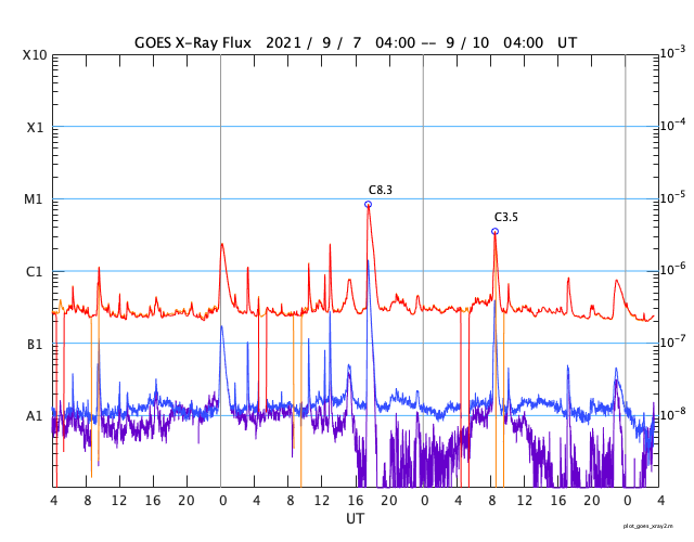 GOES衛星の太陽X線強度。赤・橙 = 0.1〜0.8 nm、青・紫 = 0.05〜0.4 nm (c) データ:NOAA/SWPC、作図:宇宙天気ニュース ![]() | ||||||||||||||||||||||||||||||||||||||||||||||||||||||||||||||||||||||||||||||||||||||||||||||||||||||||||||||||||||||||||||||||||||||||||||||||||||||||||||||||||||||||||||||||||||||||||||||||||||||||||||||||||||||||||||||||||||||