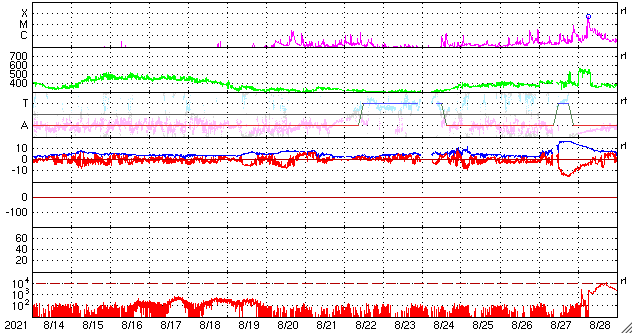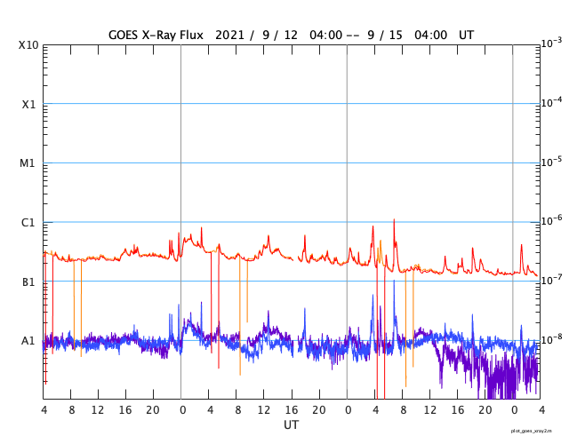 GOES衛星の太陽X線強度。赤・橙 = 0.1〜0.8 nm、青・紫 = 0.05〜0.4 nm (c) データ:NOAA/SWPC、作図:宇宙天気ニュース ![]() | ||||||||||||||||||||||||||||||||||||||||||||||||||||||||||||||||||||||||||||||||||||||||||||||||||||||||||||||||||||||||||||||||||||||||||||||||||||||||||||||||||||||||||||||||||||||||||||||||||||||||||||