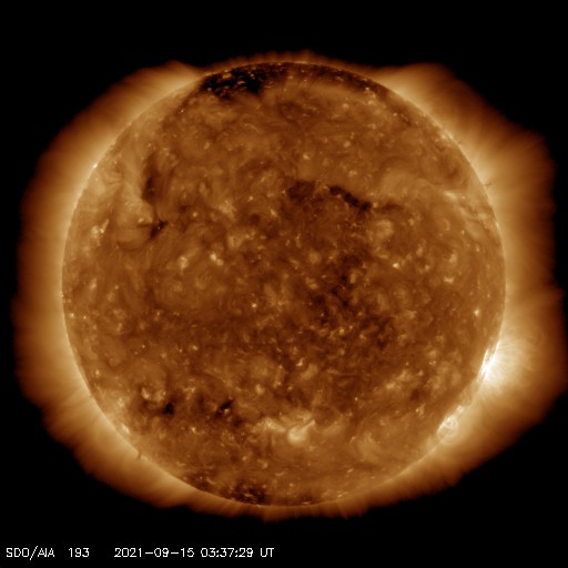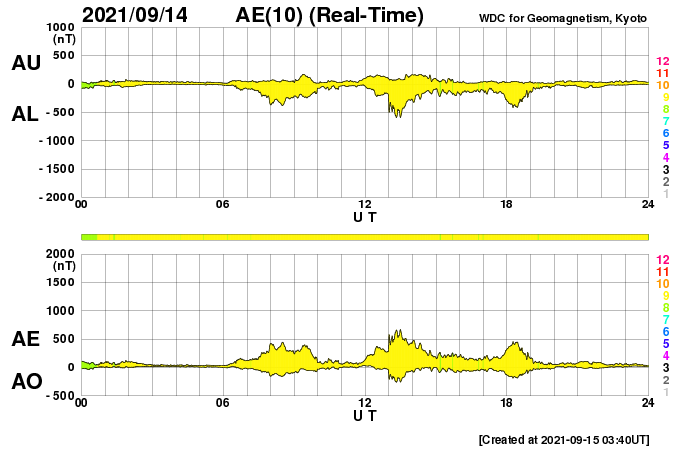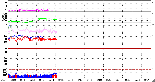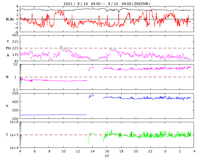 2021/ 9/15 12:50 更新 太陽風は平均的な速度に戻っています。太陽は無黒点になりそうです。 担当 篠原 太陽風の速度は、グラフの中程まで欠測していますが、 昨日よりも少し下がって、 440km/秒と平均的な速度に戻っています。 速度の弱い高まりはこの辺りで終わりそうです。 太陽風の磁場強度は、5nTから4nTへ少し下がっていますが、 平均的な状態です。 磁場の南北成分は、 昨日のニュース以降は弱い南寄りになっています。 このため、磁気圏の活動も発生していて、 AE指数は、500nTくらいの変化が 数時間おきに発生しています。 27日周期の図を見ると、前周期の太陽風は、 速度が下がって低速風になる頃です(8月19日)。 今回はどのタイミングで低速になるでしょうか。 SDO衛星AIA193では、 太陽の中心部にコロナホールは見られません。 太陽は、南西の端(右下)に2866黒点群が見えるだけで、 この後、無黒点になりそうです。 X線グラフも、先に沈んだ2868群で C1.1の小規模フレアが発生した程度で、 この後はさらに静かになりそうです。