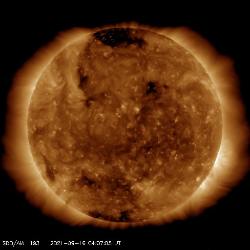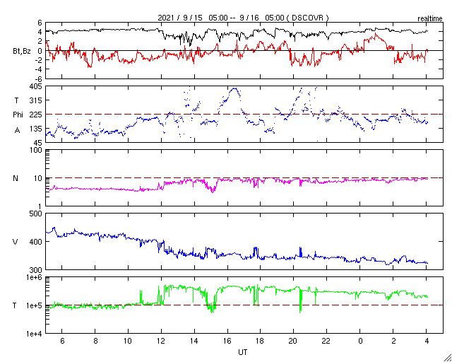 2021/ 9/16 13:20 更新 太陽風は低速になり、磁気圏は穏やかです。太陽は無黒点です。 担当 篠原 太陽風は、昨夜のうちに400km/秒台を割り、 現在は320km/秒と低速になっています。 27日周期の図の前周期の太陽風と、 同じ様な下がり方になりました。 太陽風の磁場強度は、4nT前後と平均的な状態です。 南北成分は、小幅で南北に振れています。 磁気圏は穏やかになっていて、 AE指数のグラフは、 次第に変化が見られなくなっています。 SDO衛星AIA193は、全体がぼんやりと光っていて、 コロナホールは極域に見えるくらいです。 太陽風は穏やかな状態が続きそうです。 太陽は、2866黒点群が西に沈み、 無黒点になっています。 X線グラフは、変化がなくなるとともに、 全体の強度も下がっています。 STEREO Ahead衛星によると、 太陽の東端の30度ほど向こう側に 活動的な領域がある様です。 次の注目はこの領域になりそうです。 ![]() SDO衛星のAIA193カメラによる太陽コロナの様子 (c) SDO (NASA) ![]() SDO衛星による太陽の可視光写真 (c) SDO (NASA) ![]() DSCOVRが観測した太陽風の磁場(1番上の枠、黒線は全体の強度、赤線は南北成分) および、太陽風の密度(3番目の紫線)、速度(4番目の青線) (c) データ:NOAA/SWPC、作図:宇宙天気ニュース ![]() AE指数(速報値) 下段のAEグラフの値が高くなると、オーロラ活動が活発化しています。 (c) 京都大学WDC ![]() ![]() 27日の太陽周期に合わせたデータプロット 太陽が同じ面を地球に向けていた27日前の変化から、今後を予想することができます。 (c) 作図:宇宙天気ニュース