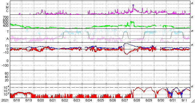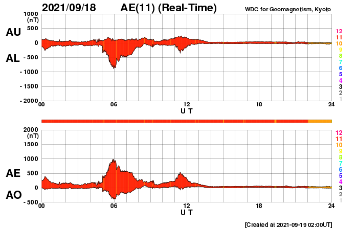 下段のAEグラフの値が高くなると、オーロラ活動が活発化しています。