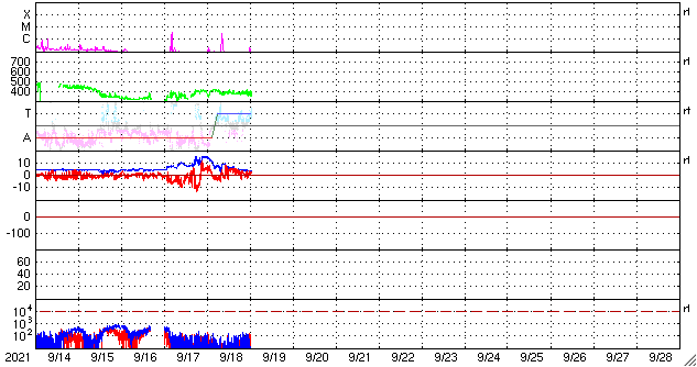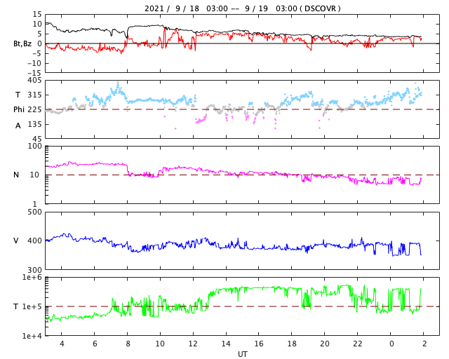 2021/ 9/17 12:36 太陽風は低速で、磁気圏も穏やかです。太陽は無黒点です。