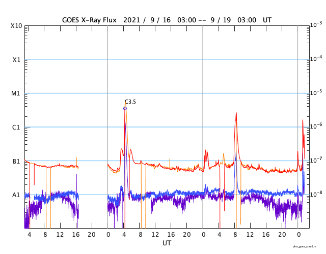 GOES衛星の太陽X線強度。赤・橙 = 0.1〜0.8 nm、青・紫 = 0.05〜0.4 nm