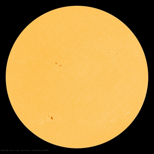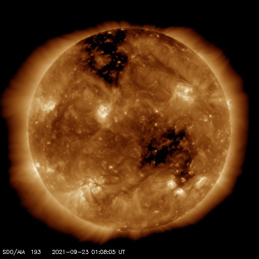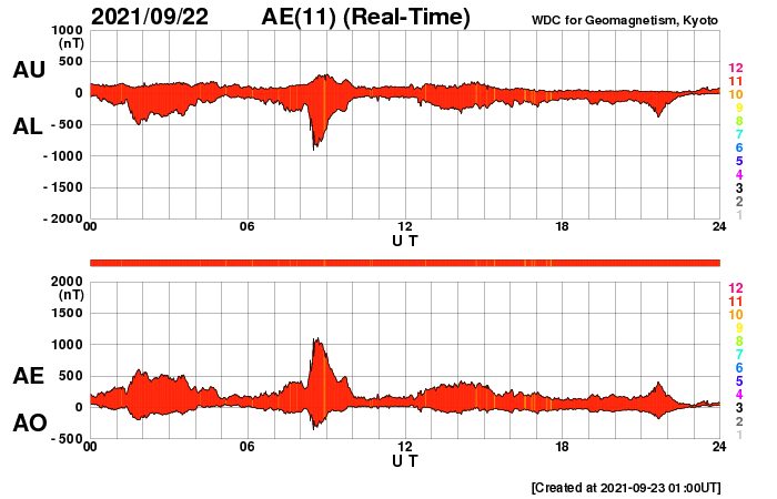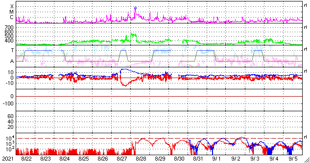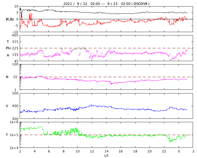 2021/ 9/23 10:22 更新 太陽風はやや低速です。コロナホールの影響が始まりそうです。 担当 篠原 太陽風は、350km/秒から370km/秒へ少し速度が上がり、 やや低速くらいになっています。 磁場強度は、強まりが終わって、 5nT前後で推移する様になっています。 磁場の南北成分は、グラフの前半は南寄りですが、 後半は0nT付近になっています。 やや活発になっていた磁気圏の活動もそれと共に低下して、 AE指数は、前半は1000nTに達する大きな変化も発生していますが、 後半は小幅の変化に留まっています。 この後は、より穏やかになりそうです。 一方、SDO衛星AIA193では、 南半球のコロナホールは西側にだいぶ進み、 地球への影響がそろそろ始まるかもしれません。 太陽風の磁場強度の強まりに注目してください。 太陽は、南西(右下)の黒点に、 2874、2875群と番号が付けられています。 昨日はもうひとつ右に黒点がありましたが、 現在は見えなくなっています。 南東(左下)の2871群でC1.1の小規模フレアが発生した程度で、 活動は穏やかな状態です。