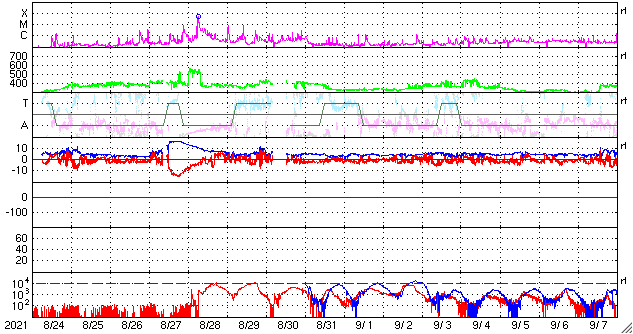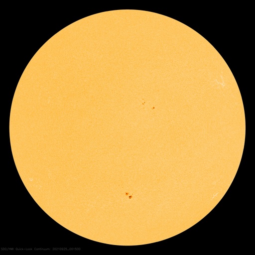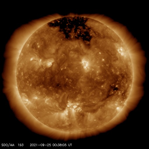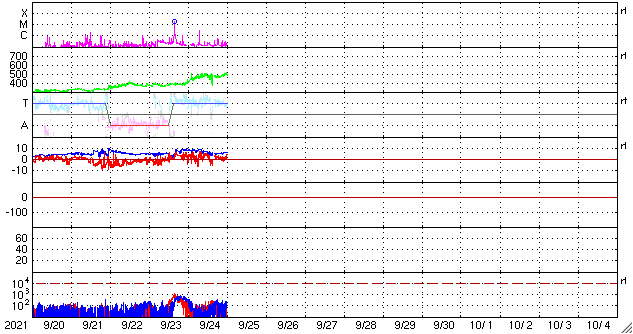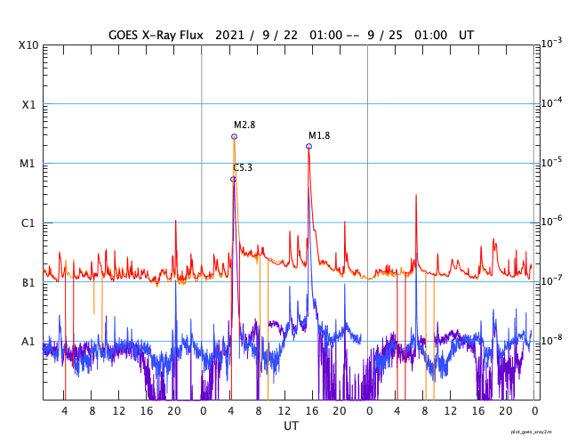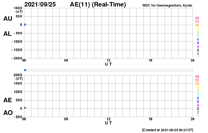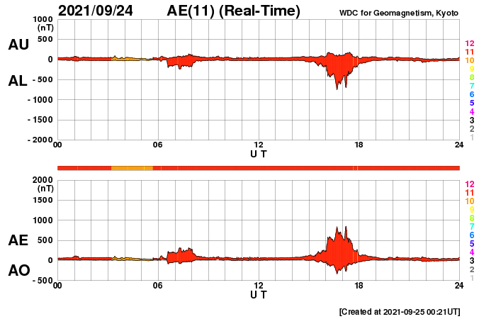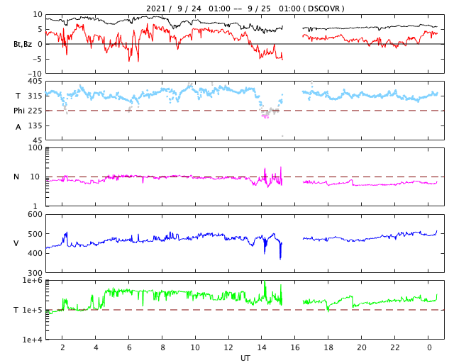 2021/ 9/25 09:49 更新 太陽の活動は落ち着いています。太陽風は高速風になりました。 担当 篠原 Mクラスのフレアを起こした2871黒点群の すぐ左上に新しい黒点が現れ、 2876群と番号が付けられています。 ここで、24日16時(世界時24日7時)に C2.9の小規模フレアが発生しています。 NOAAのフレアの記録では2871群での発生となっていますが、 2876と番号が付けられる前の記録のためかもしれません。 2871群周辺では小さい活動が頻繁に発生しています。 引き続き注目してください。 また、太陽の北東(左上)と南東(左下)に 小さい黒点が現れている様です。 太陽風は、昨日のニュース以降も少しずつ速度が上がり、 ちょうど500km/秒に達したところです。 磁場強度は、5〜6nTと平均的な値に戻っています。 磁場の南北成分は、北寄りの傾向が続いています。 磁気圏は基本的には静穏ですが、 太陽風の磁場が一時的に南を向いたところで、 AE指数に800nTの中規模の変化が発生しています。 SDO衛星AIA193では、 南半球のコロナホールは、太陽の西の端に近付いています。 この領域の影響による太陽風速度の高まりは、 この辺りまでかもしれません。 一方、北極から中緯度にかけてコロナホールが縦に伸びています。 前周期よりも縦の広がりが大きくなっているので、 今回は太陽風にも変化が現れるかもしれません。 明後日、27日以降の変化に注目してください。